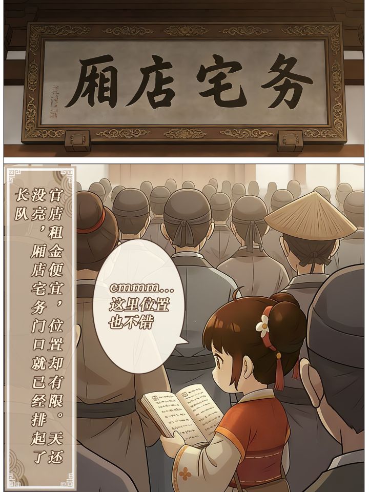 被赶出家门之后,我找到了爷爷留下的信✉️, 信不长,却让我下定了一个决定—— 重新开店🏮。为了找到合适的门面,我随便找了家旅馆过了夜🛏️, 天还没亮就去了厢店宅务排队。 官店的租金确实亲民, 可位置要么偏远,要么规矩繁多, 怎么看都不适合做酒店。不甘心的我,只好开始在城里四处打探民店。 结果一家比一家贵💰, 有的地段好得夸张,租金也同样夸张💸; 有的价格看着还能接受,却连人影都见不到。站在街