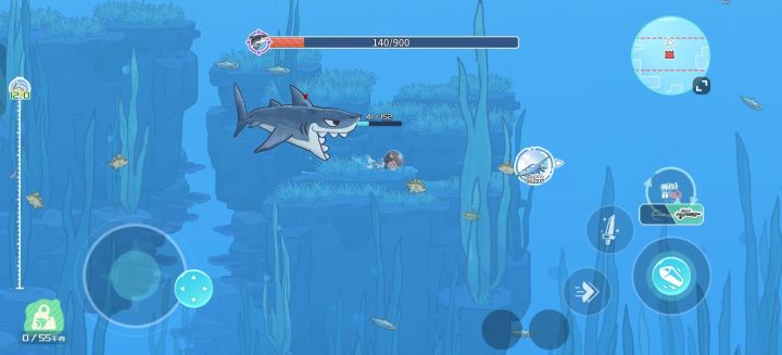 最好玩的还是下海捕鱼!鱼都是QQ的形状,用电叉叉一堆鱼特别爽!偶尔还会遇到发光的神奇鱼!不过体力耗得好快哦,经常捞到一半就累得划不动了……建议新手多攒点氧气和小摩托再往下