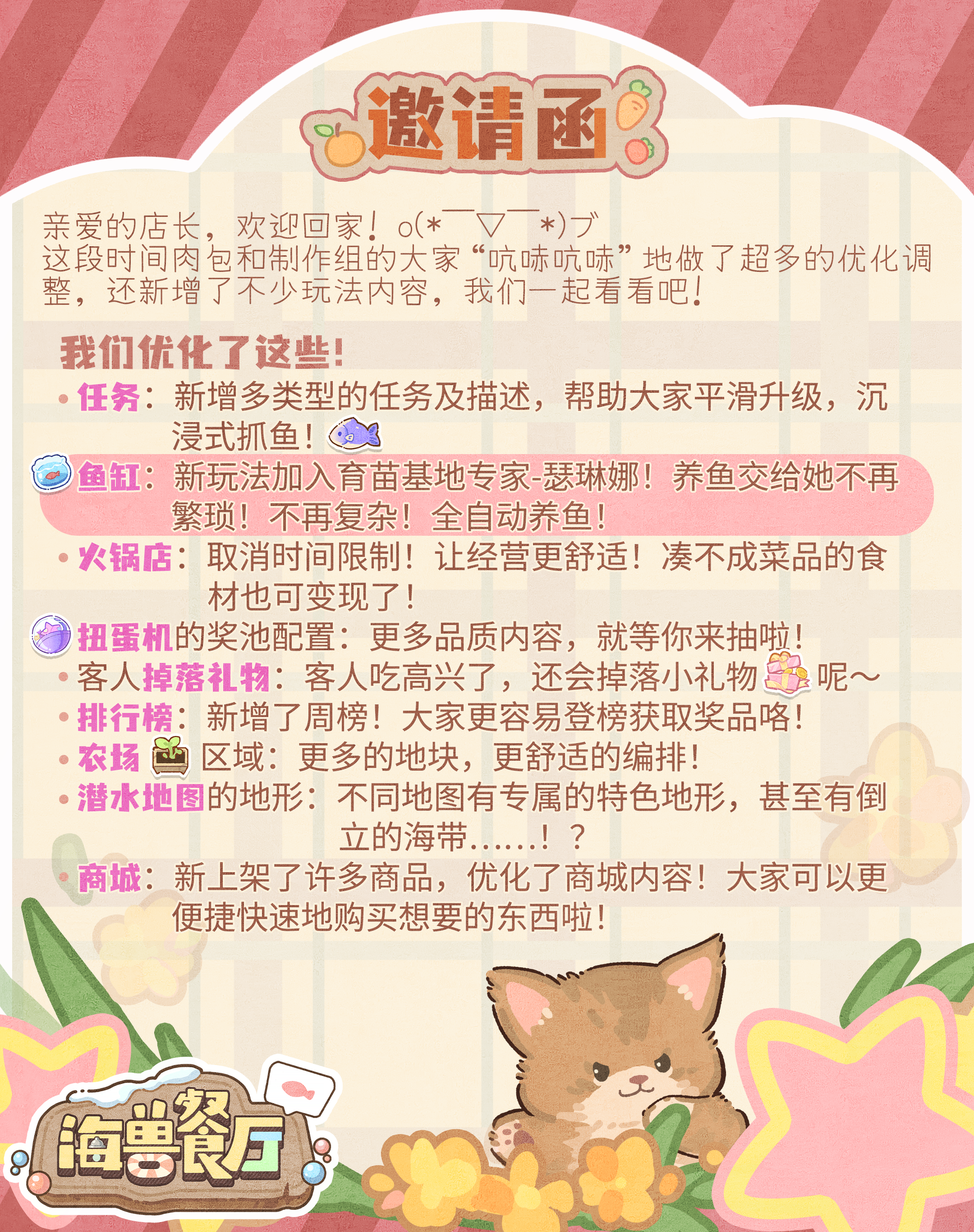 🏮岁末将至,店长今年有什么跨年安排呢?不如来海兽餐厅一起过吧!🔔听说会有一位神秘的小小客人出现在餐厅里哦——💢“哼哼!别小看我,在下可是食谱神!”✨全新活动 | 食谱的星愿⏰活动时间:12月31日10:00 - 1月6日0:00🚩解锁条件:开启主餐厅二区🎮活动玩法:1、活动期间在主餐厅上架含有主题食材的餐品,客人品尝后每道菜可额外获得30枚金币,同时收获一定数量的星