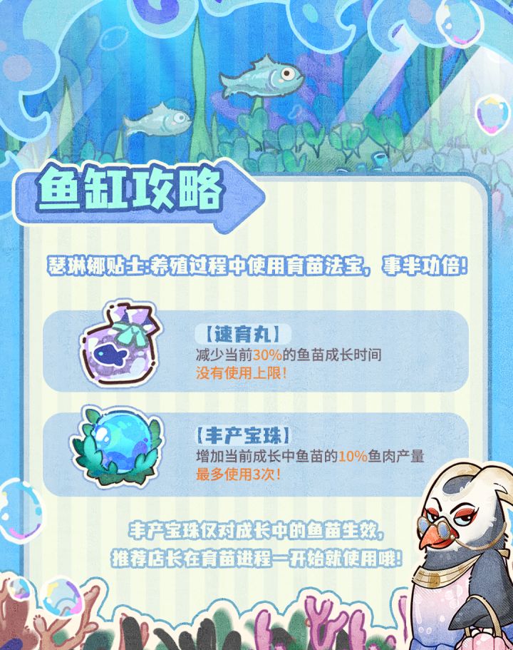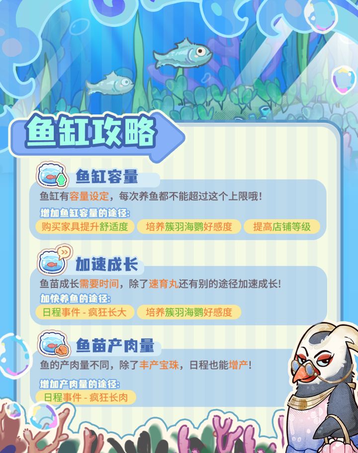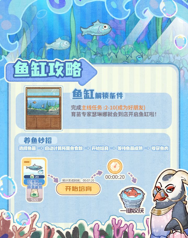 🔈店长,您闲置的鱼缸可别落灰啦!!完成主线任务2-10 <成为好朋友>后即可解锁鱼缸功能~肉包和育苗专家·瑟琳娜,一起整理了这份养鱼指南!从养鱼步骤、育苗法宝,到鱼缸属性提升方法快快收藏这份指南,成为海兽餐厅育苗大师吧!#海兽餐厅 #今天游戏圈发生了啥 #休闲游戏 #发现好游戏 #模拟经营