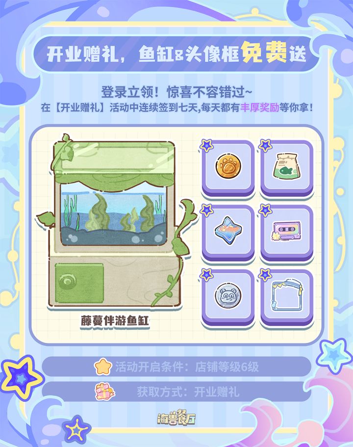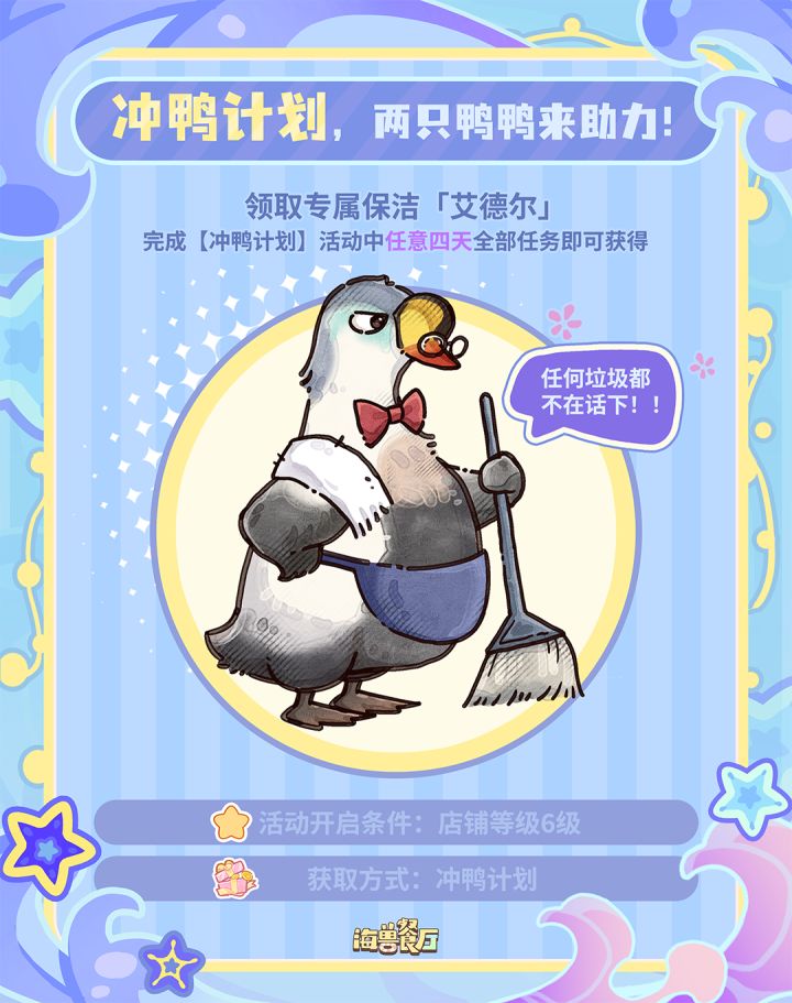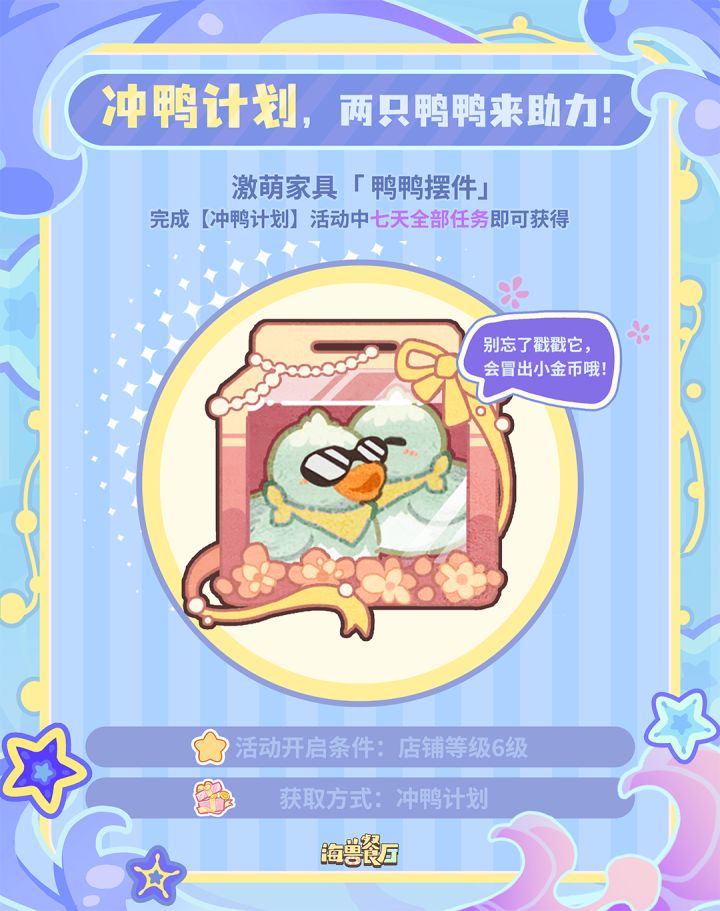 《海兽餐厅》浪花测试火热进行中!这一波测试福利别错过啦~📅签到福利:在【开业赠礼】活动中连续签到7天,可得精美头像框和清新鱼缸家具!🦆专属员工:完成【冲鸭计划】活动中任意4天全部任务即可领取 专属保洁员工 - 艾德尔!🕶激萌家具:完成【冲鸭计划】活动中7天全部任务即可领取 超可爱的鸭鸭摆件家具,点击还会掉落金币哦!🚩活动参与条件:店铺等级6级后解锁集模拟经营和海洋探索于一身的《海兽餐厅》