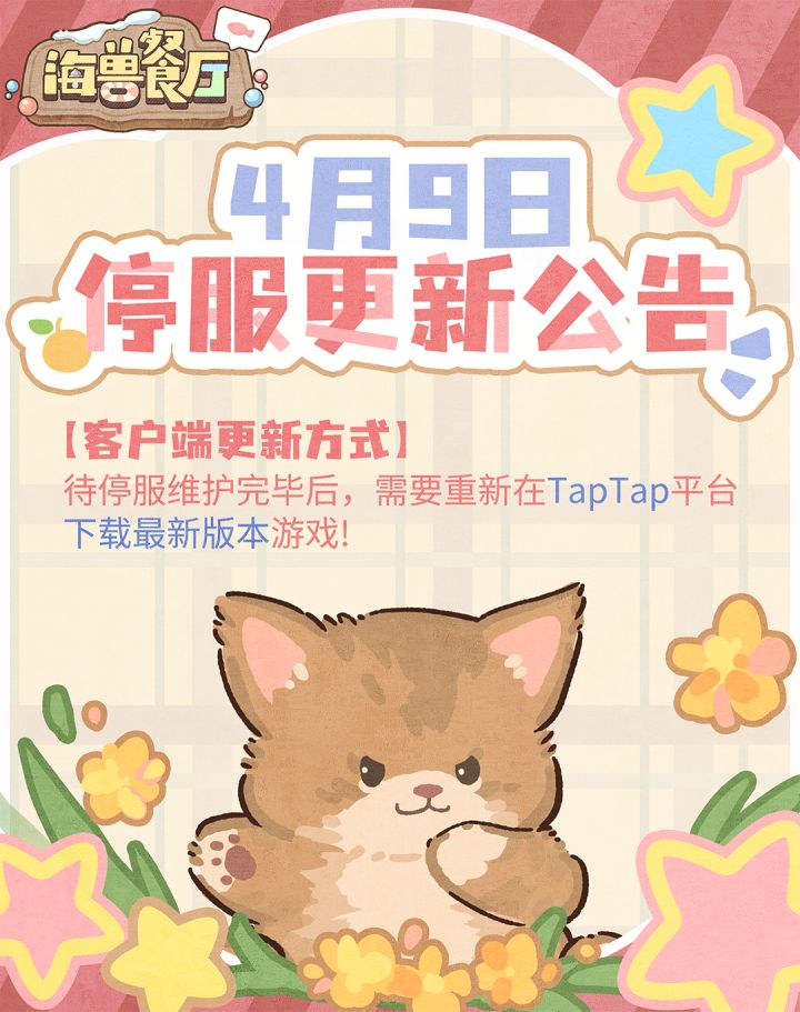 亲爱的店长: 为了给大家提供更好的游戏体验,我们将在4月9日 19:00 - 20:00进行停服维护⭐【客户端更新方式】 待停服维护完毕后,重新在TapTap平台下载安装最新版本游戏~🎁【维护补偿】 我们将通过邮件发放补偿【救援卡*1、星砂*300、金币*5000】,邮件有效期30天,请及时领取哦。🚩【修复及优化】1、修复宣传上菜引导、茶点引导卡住2、修复登录引导与潜水结算重叠卡