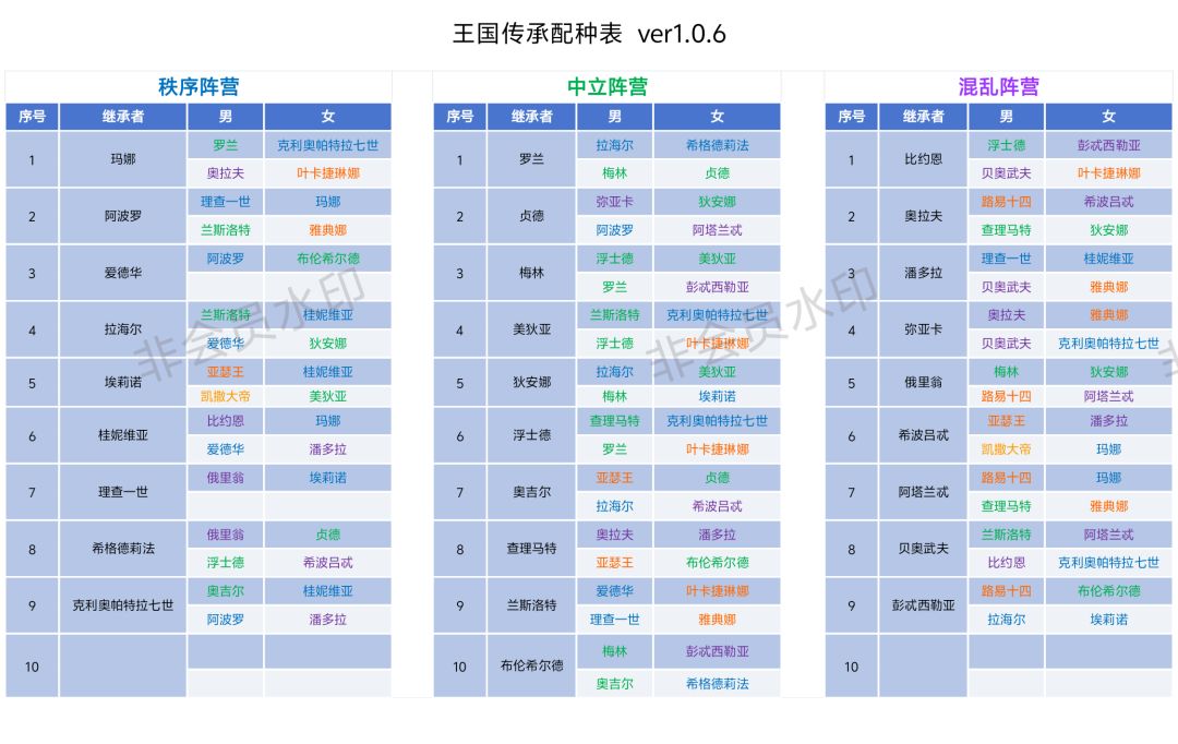 相信很多细心的小伙伴们已经发现,秘闻里生出英雄的搭配是固定的,每位英雄目测是两条搭配方式。 那如何搭配?将英雄任职取消自动,卸下所有英雄,将房屋腾空。在任职里放一队搭配方式,将男英雄分配住宅,等一段时间后,传承状态变为确定中,再放入下一对,依次操作。注意:男英雄的直男操作会导致传承状态由确定中变为未确定,需要手动调整回来。 当然,角色多的也可以像我第二张图那样办。 现将我所统计的搭配方式公布