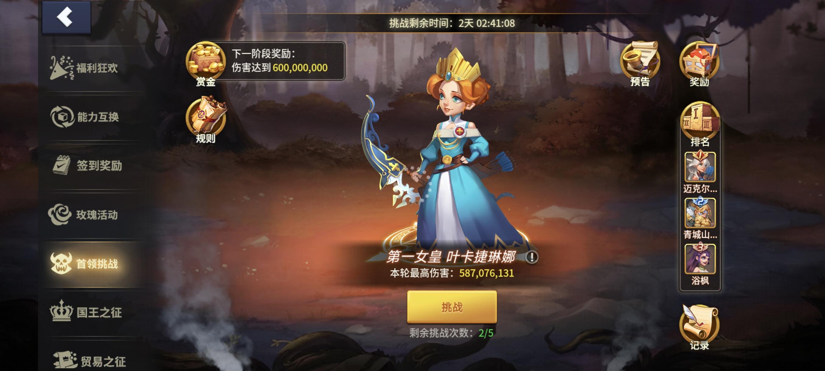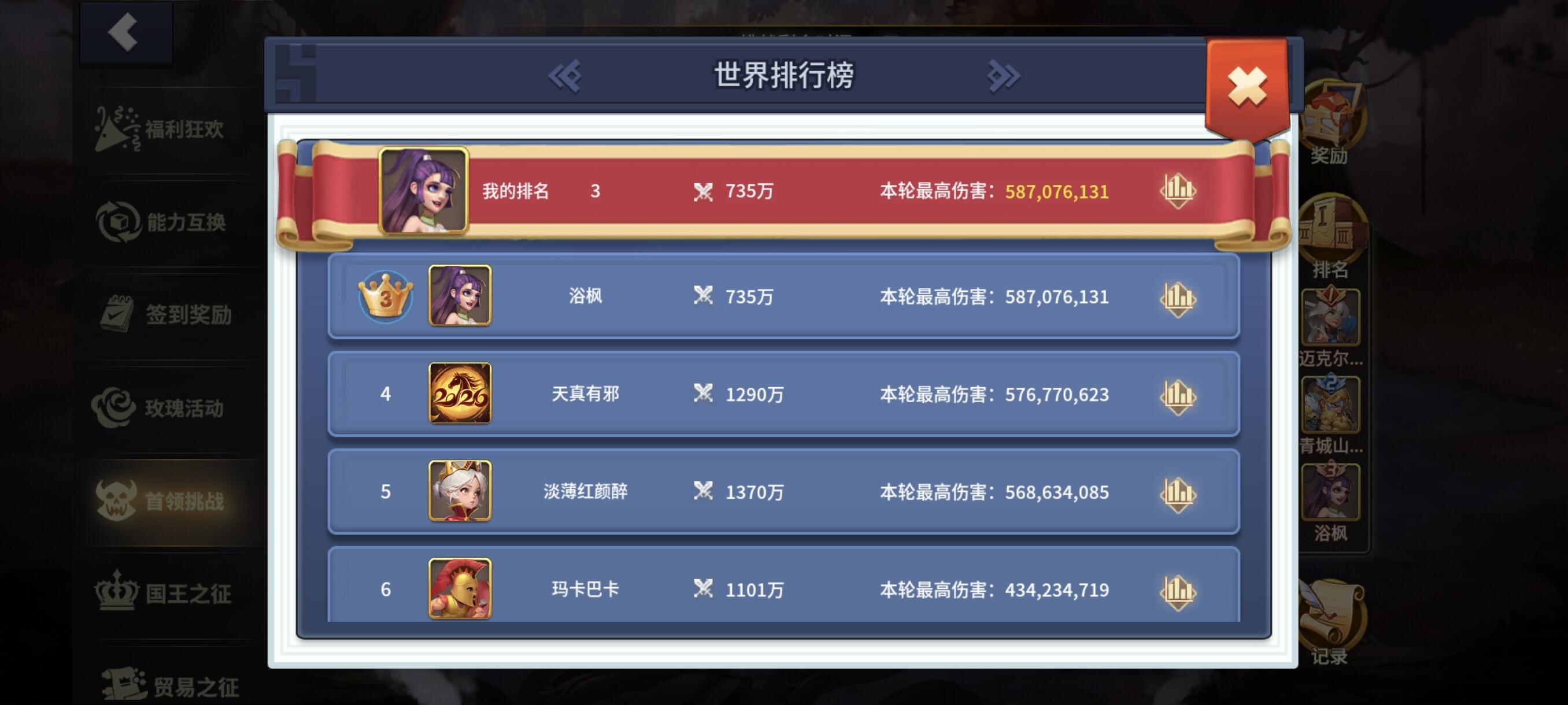 关于首领挑战,我以低于其他人更低的战斗力,打上前3,代表了阵容的合理性。从我这里开始,就是战斗力的分水岭,前面那几个是我的2倍最终伤害。我承认他们很强,可我没办法学,只能挑偏门的办法去打,无论如何搭配,最终的目的就是让最高能打出伤害的英雄打出更多伤害,或者说降低伤害,分出一个小C打出均摊伤害。#王国传承