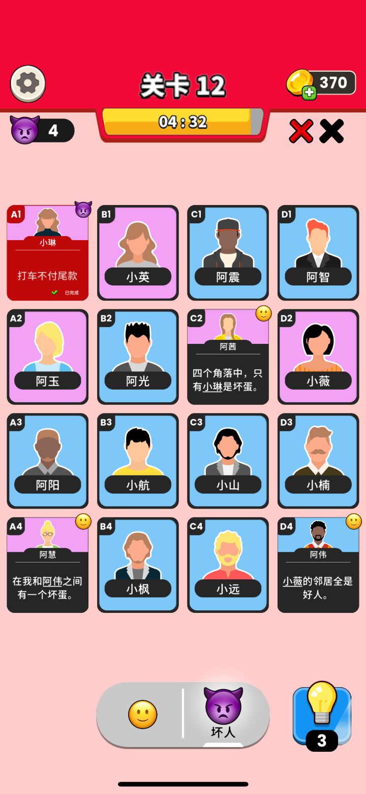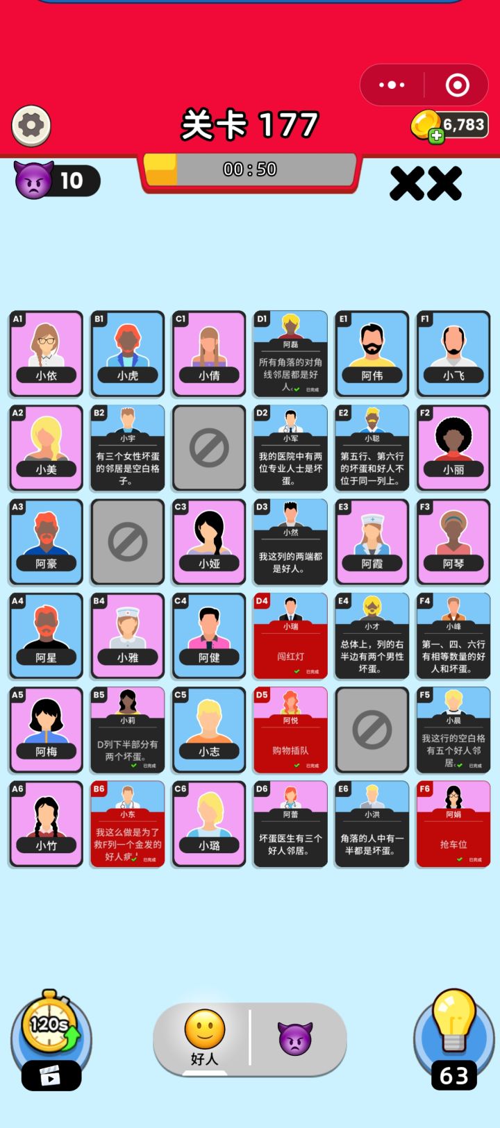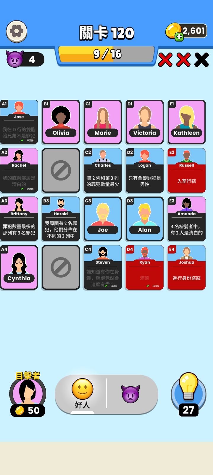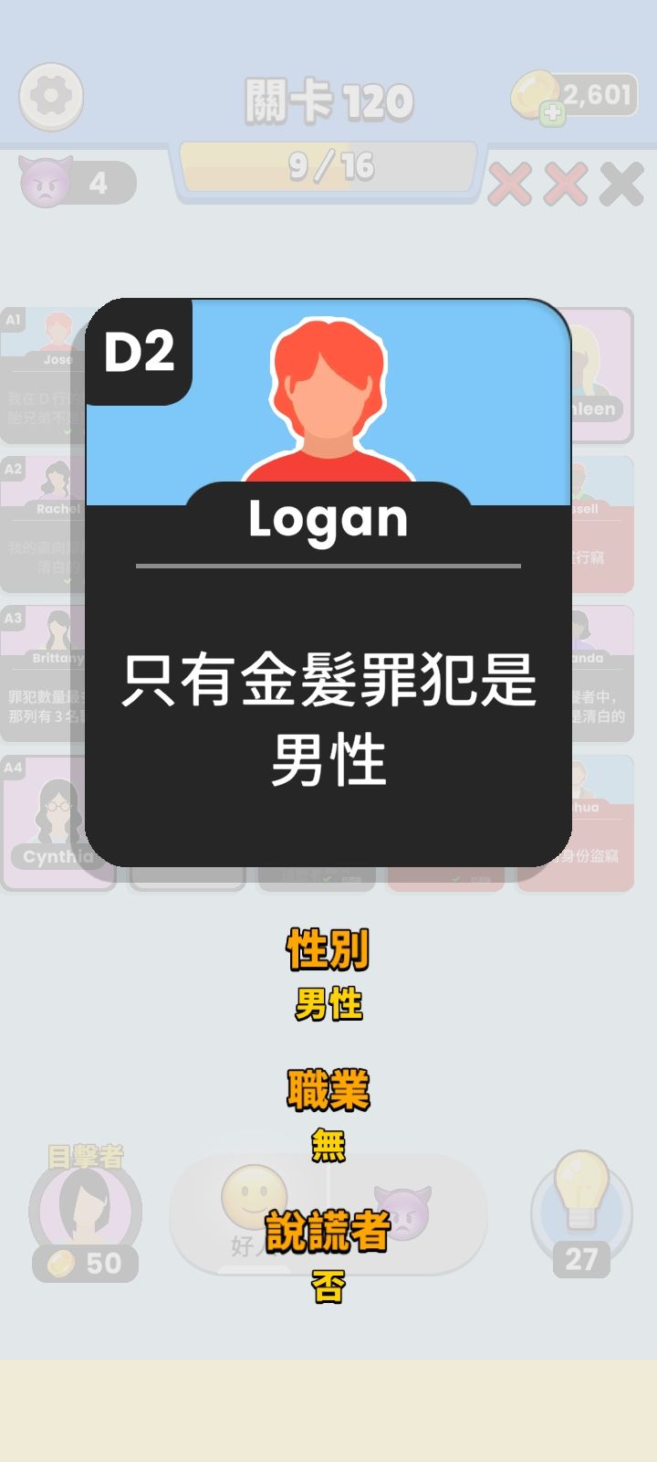 “只有金发罪犯是男性”的意思不就是其他发色的男性都不是罪犯?也是我手快,直接两个其他发色都点开错了而且我玩到这120关,没看到有说谎者,是根本就没有吗?