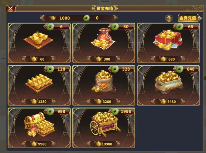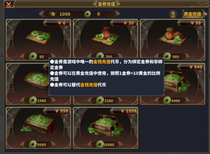 【攻略05】游戏中黄金充值1折1、游戏中需要先使用RMB充值金券,6元=60金券2、然后使用金券充值黄金,6金券=60黄金