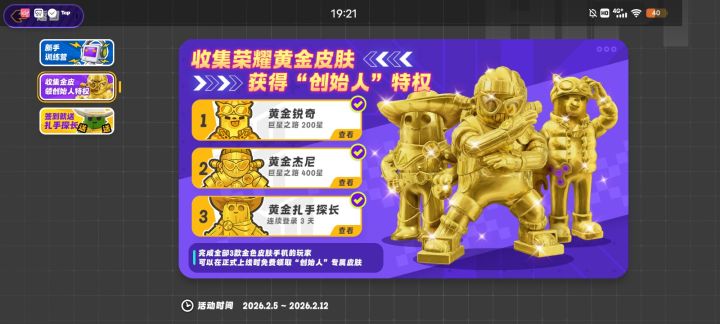 【测试专属福利】收集黄金皮肤,解锁正式上线“创始人”限定皮肤✨各位亲爱的玩家们~ 感谢大家在测试期间的陪伴与支持!为回馈每一位参与测试、助力游戏成长的你们,制作组特别推出专属福利活动,只需收集指定黄金皮肤,就能在游戏正式上线后,即可免费解锁“创始人”专属限定皮肤,这份专属荣耀,只属于一路同行的你👇玩家交流群:956482303🌟 活动核心福利活动期间,成功收集 3款黄金皮肤(扎手探长/杰尼