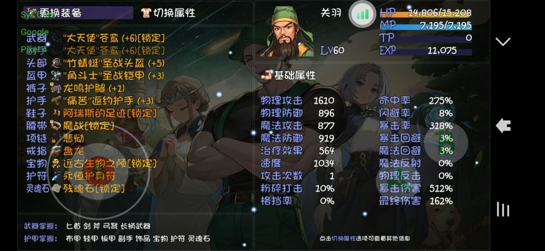 关羽没有60的长柄武器前,可以将就用60副本爆的弓弩。灵魂石带个有鬼龙闪的。 装备带圣战套,我因为差手套,就带的2件,看个人喜好。基本稳定2连9000万。装备配装如图,因为爆率太低,都是些垃圾,哎,太难刷装备了。
