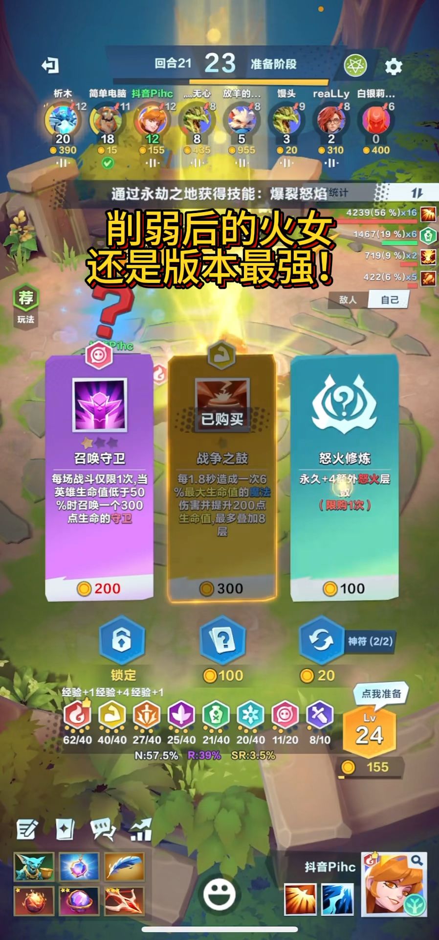 版本最强轮椅英雄,七日签到就能免费拿(这大概是火女最大的缺点) 核心流派:怒火、生命 选英雄看流派池子,本局怒火流没被BAN并且当前解锁了火女,就能随机到这个英雄,但不代表什么情况都一定能吃鸡 主要就看俩流派,生命和寒霜,有生命没冰无脑选没人打的过你 没生命流就换个思路,用护盾、回复流攒火,普攻多的局,换闪避,实在不行守卫也可以!突出一个活着就是输出 前期1~8回合不选牌打连败攒经济,但是看到燃烧