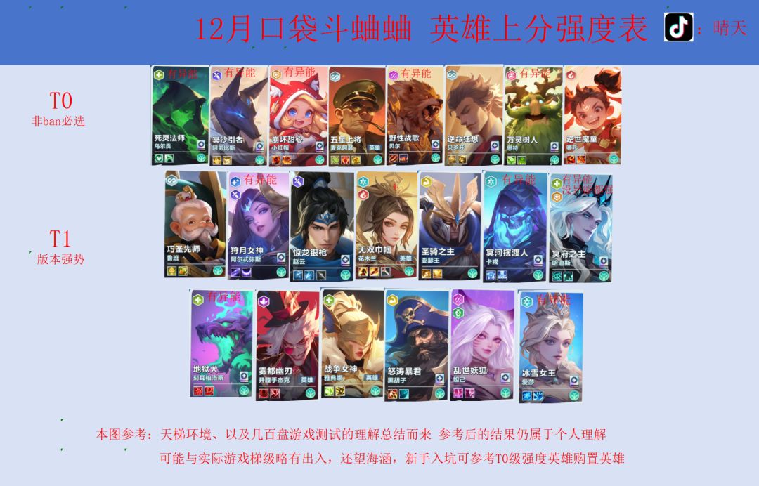 12月最新英雄(包含异能)强度表 我是dy主播:晴天 这个表格主要给新入坑萌新推荐强势英雄上分必备 表格跟你们心里英雄梯度排行有异议的可以评论区讨论 #口袋斗蛐蛐 #游戏攻略 #发现好游戏
