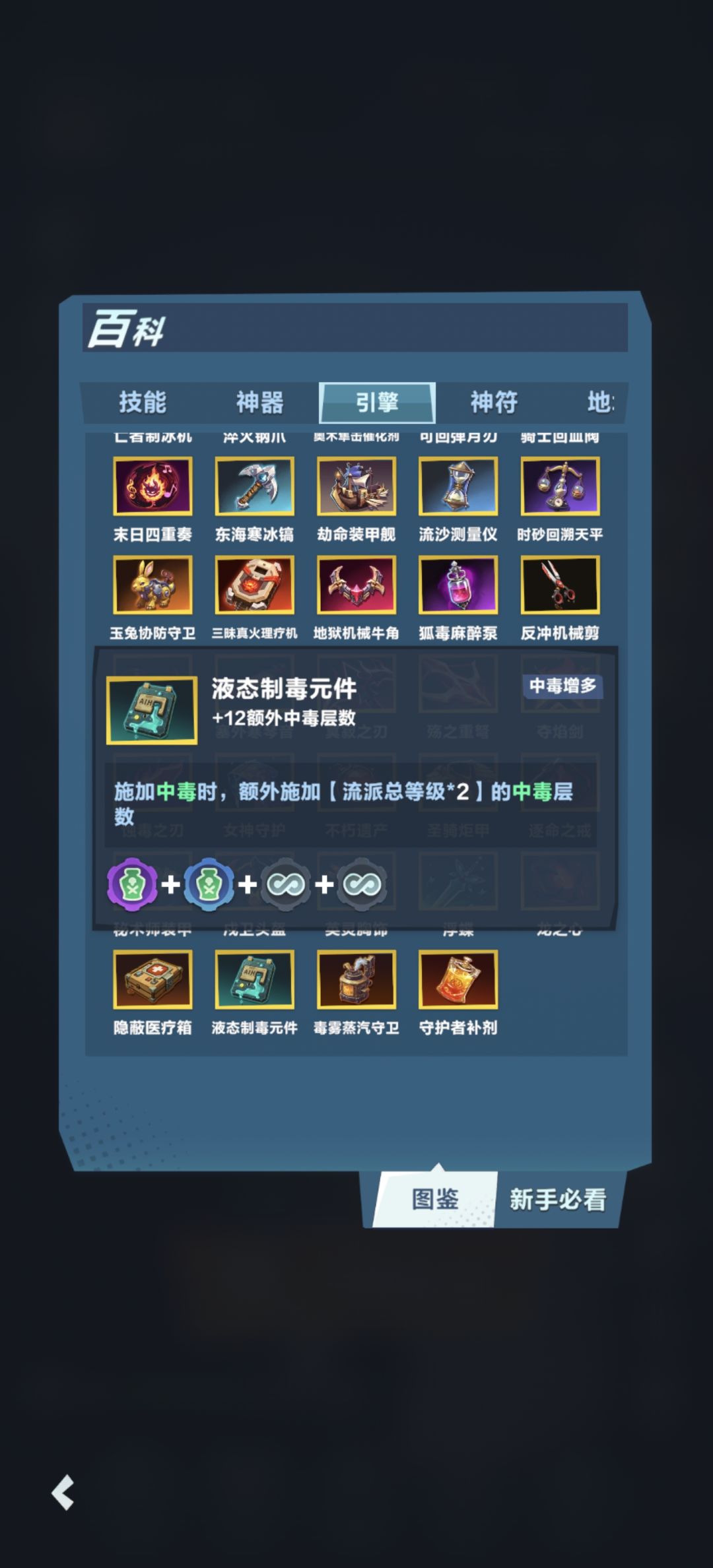 新赛季有很多人不知道引擎怎么选择的话不妨来看一下 我也是我也是测试了一下,玩好几把也碰不到一个金,所以总结了紫色引擎加蓝色引擎的最强装备。 激活引擎 液态制毒元件 想要达到激活条件,首先要拥有一个蓝色的毒引擎和一个紫色的毒引擎。 刮骨毒疗精油,则是需要一个回复的蓝色引擎和一个毒的蓝色引擎才能激活。 邪瘟咒釜只需要一个毒的蓝色引擎就行 游戏思路 所以说从一开始的时候不需要去打连胜,因为引擎是按血量来