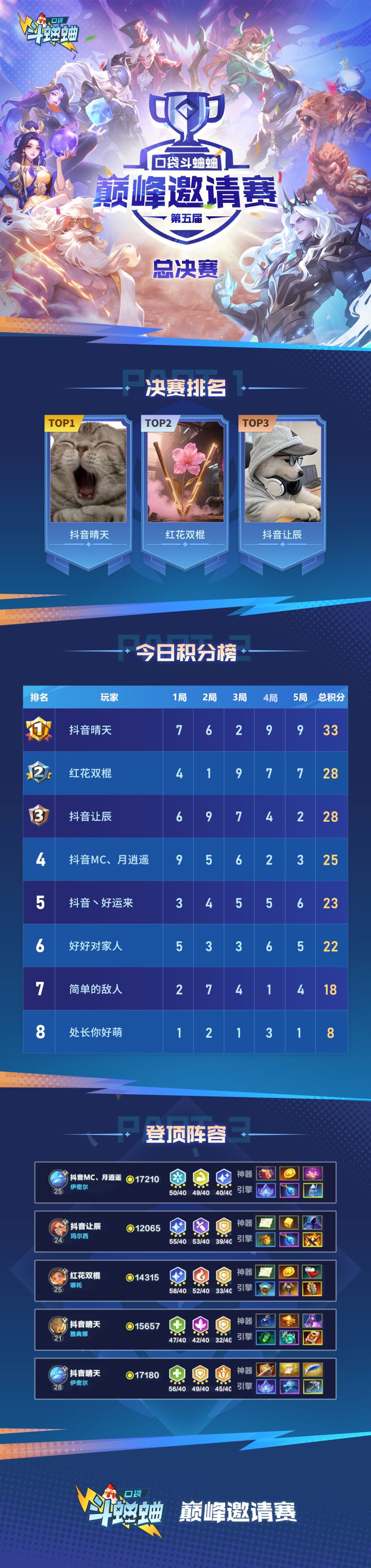 🌟决赛Top3荣耀诞生🌟🥇 冠军:【抖音晴天】🥈 亚军:【红花双棍】🥉 季军:【抖音让辰】✨ 特别致谢:所有参赛选手的精彩对决与召唤师们的热情支持,再次为大家奉献这场巅峰盛宴!让我们一起期待,未来为大家奉上更多更精彩的赛事活动!!