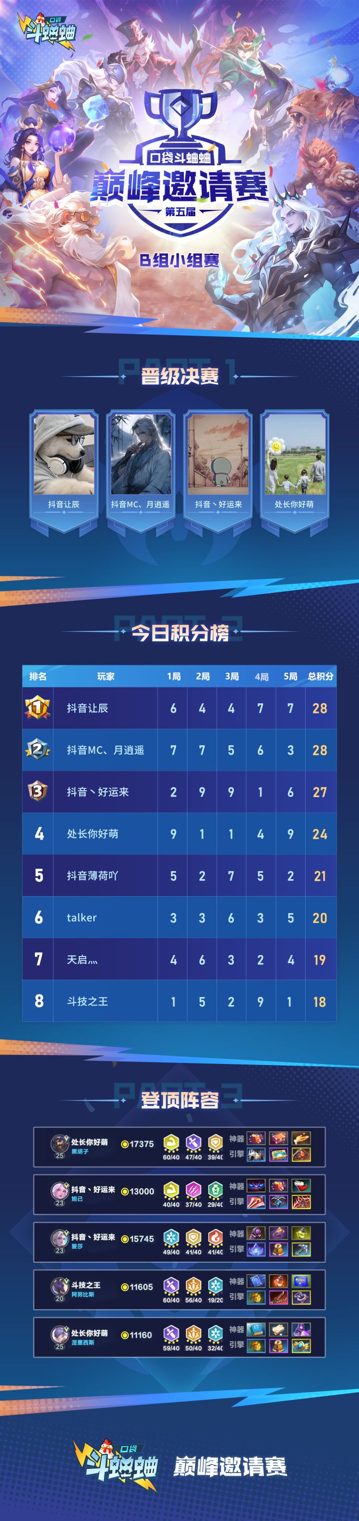 B组战报来啦!「B组」 抖音让辰 、抖音MC、月逍遥 、抖音丶好运来 、处长你好萌⬆️四位选手强势发挥,晋级决赛!锁定【口袋斗蛐蛐】抖音官方直播间!观战最终决赛,谁能登顶紫禁之巅!!