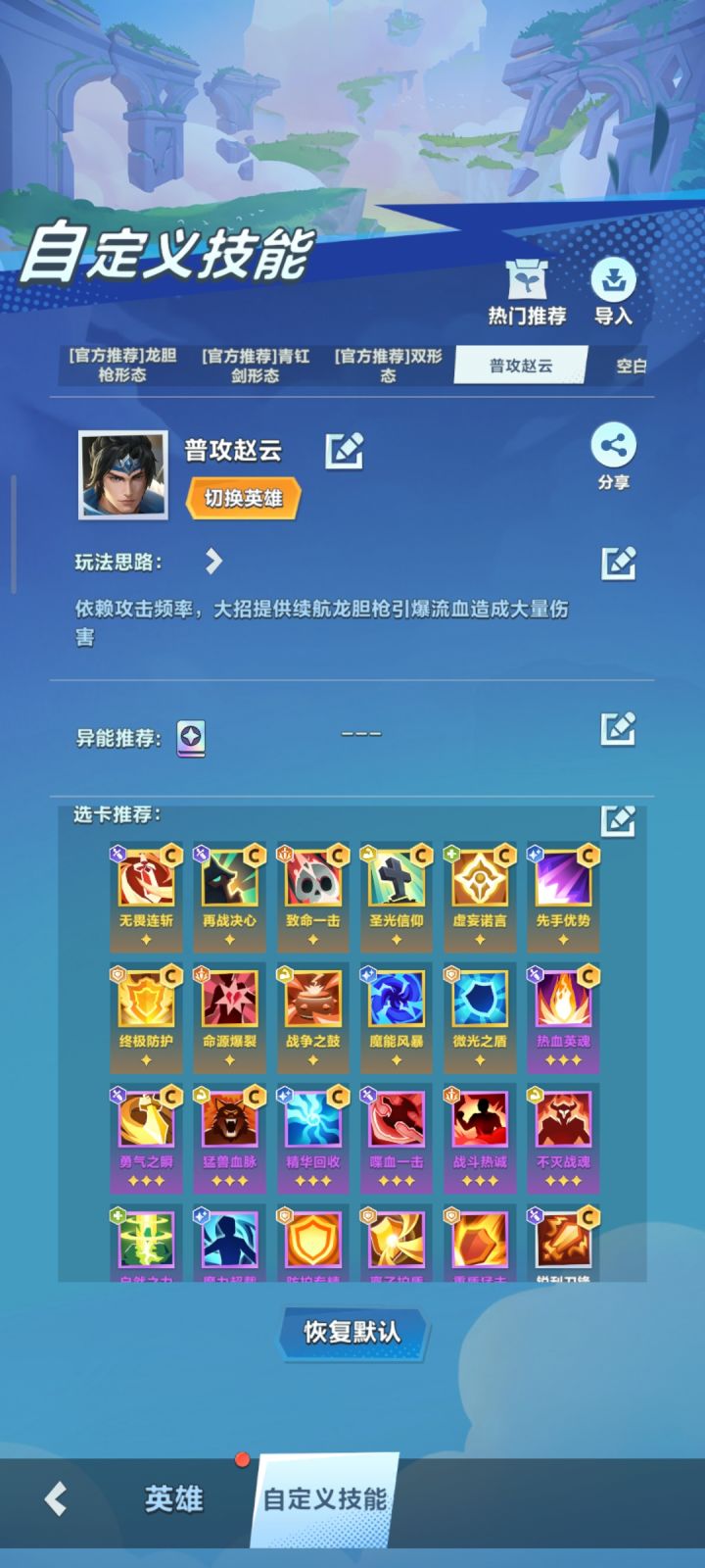 英雄前期强度很高,攻击为主打连胜!青虹剑起手! 后期流派以攻击、暴击、生命流派为主、最后拉回复、护盾找保命金卡。龙胆枪起手!