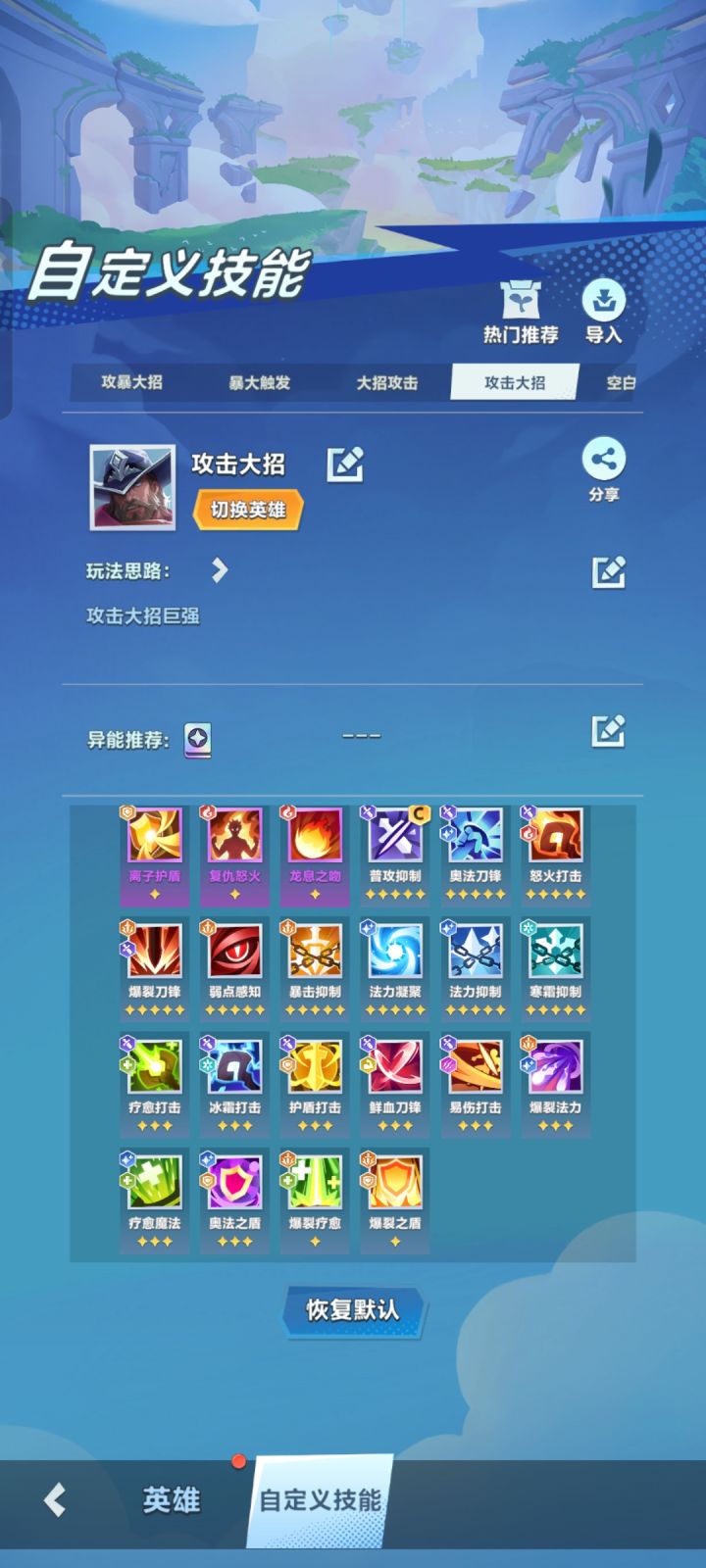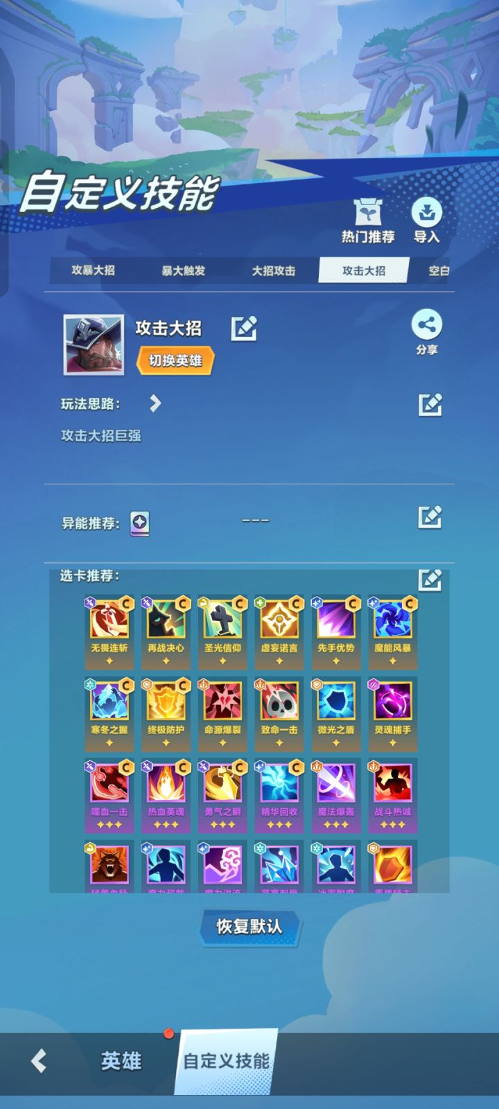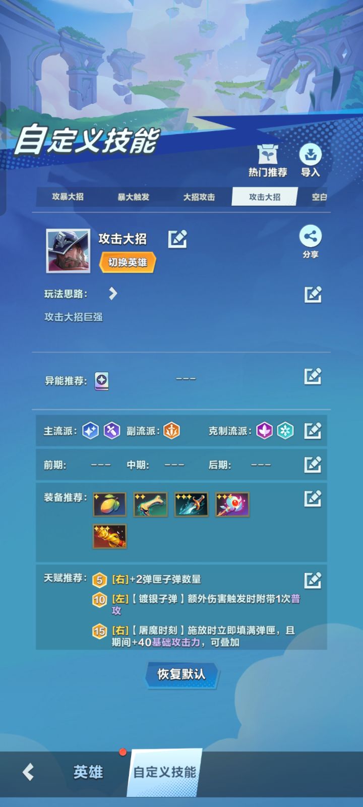 英雄前期强度很高,攻击为主打连胜!青虹剑起手! 后期流派以攻击、暴击、生命流派为主、最后拉回复、护盾找保命金卡。龙胆枪起手!