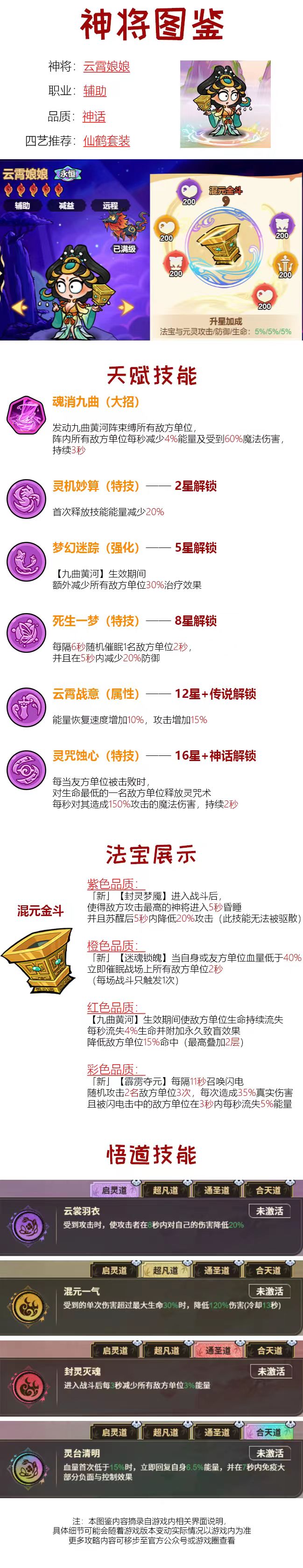 #非凡仙途云霄娘娘 大家好,我是111区的清一色杠上花,id19607681 云霄娘娘是一个控制系的辅助,在没有法宝的情况下,只需要2星就可以提前释放大招,减少敌方能量3秒,让己方队伍拿到先手。5星获得的减疗效果也是克制了现在的热门角色刘备刑天盘古等带回复的前排。8星技能,每6秒随机催眠一个角色2秒,也是一个很恶心的技能,高频率的控制让打乱对面的进攻节奏。12星被动技能增加回能和攻击让云霄娘娘更