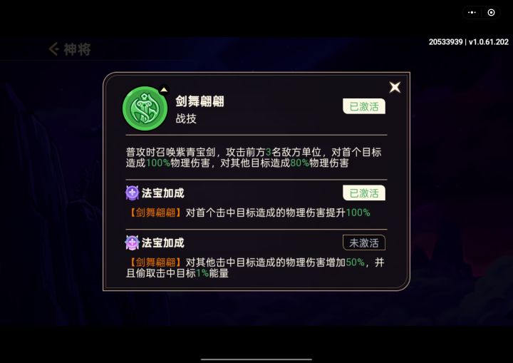 【战区:141】【账号:20533939】【昵称:赤乌玄兔未同宿】紫霞仙子,仙盟商店每日可以免费兑换五个碎片,对于中氪和白嫖党来说都是不错的选择。紫霞的技能机制可以打穿透伤害,二星技能对前方三个敌人造成伤害,16星后可以再加一个敌人,并且可以降低敌方防御。彩宝后可以增加自身攻击,而且可以偷取敌方能量。可以搭配通天教主,也是对多个敌人造成伤害,两个武将同时打贯穿。8星技能是布置一个剑阵,提升全队攻速