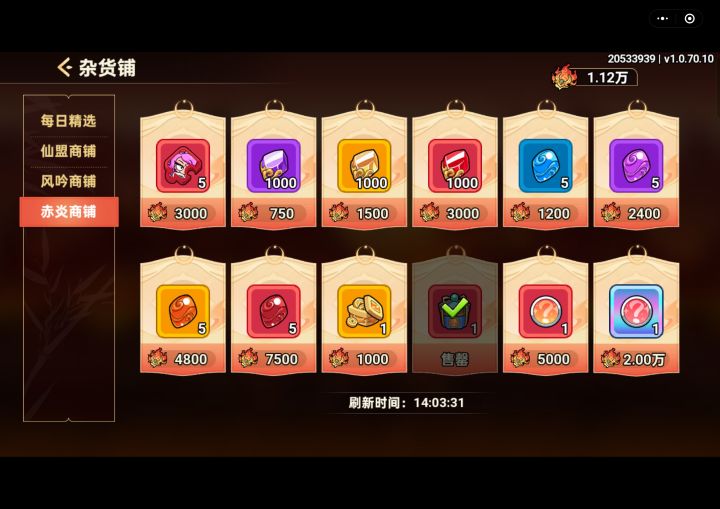 【战区:141】【账号:20533939】【昵称:赤乌玄兔未同宿】 杂货铺兑换推荐仙盟商店的仙盟币是最富裕的,前期新手可以看看先出哪个红宝,牛魔和小青都是前期过度很好的橙将,之后全红将成型后就每天拿紫霞仙子和红色升阶丹,紫霞仙子固定拿,等到置换活动可以直接置换成自己想玩的将,可以省下很多碎片。金色官印和红色灵兽升阶石可以自己酌情兑换。风吟商店的风吟币不是很充裕,要后期升级奇策可以增加获取