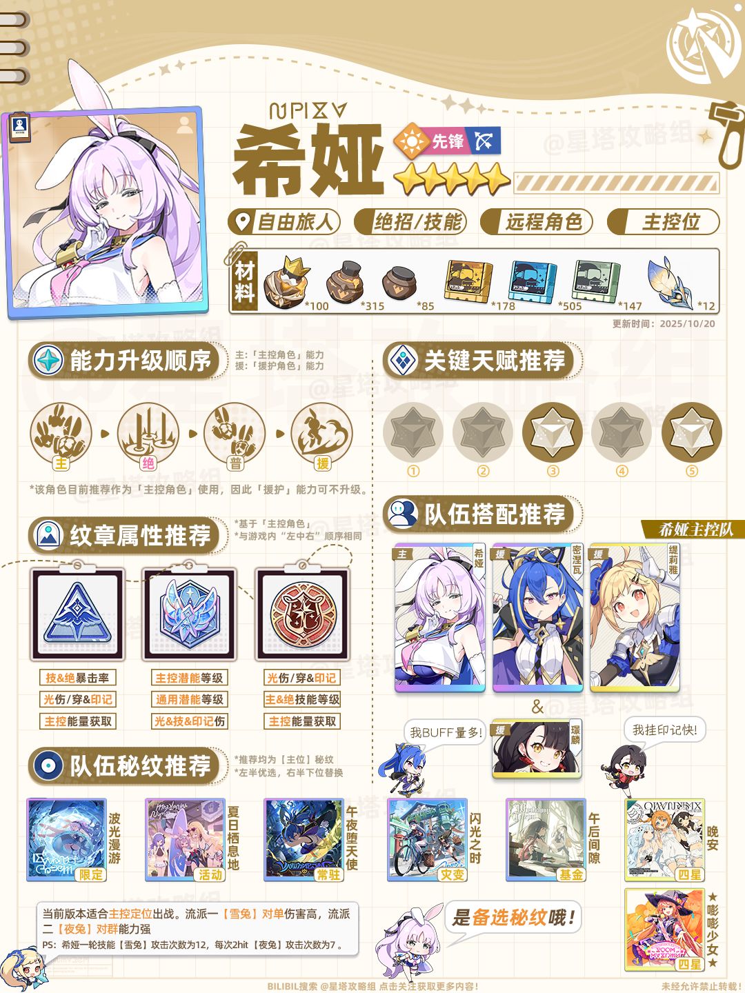#星塔旅人 新版本光队角色希娅,超高倍率让光队输出更上一层楼!本期一图流更新了详细的潜能抓取信息,以及跑A流相关潜能抓取,如有勘误欢迎评论区提出! 更新时间:2025/11/14 文案/校对:祖安水稻公主、度一喵、猫猫拳 设计:墨菊