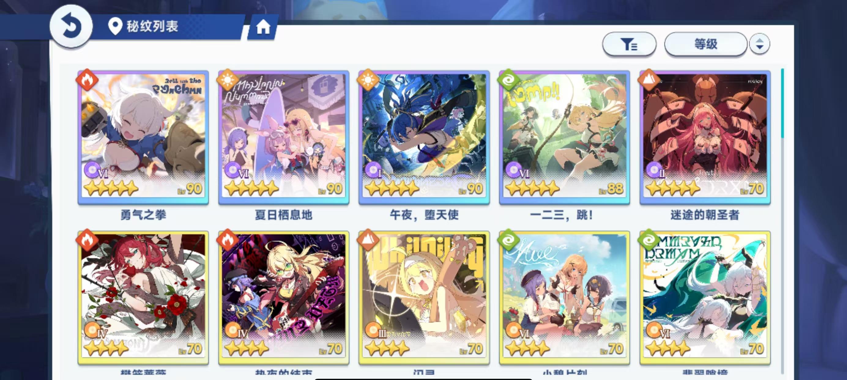 听我一句劝,能买潜能就买潜能,不要被半价音符骗钱了,也不要被彩色记录给的高数值骗了,都是假的,难度7的星塔就是刷不出来完美毕业的彩色记录的! 个人练度如图,冬香版本入坑的新号,1+0冬香,80级未突破8级技能,两个纹章是凑数的,但是超绝42抓10种核心潜能,2级的重拳轰鸣是凑数的,这个潜能在技能流派冬香里面打不了多少伤害。 辅助更烂70级未突破,技能没升纹章没有,潜能一个13抓一个16抓有多烂