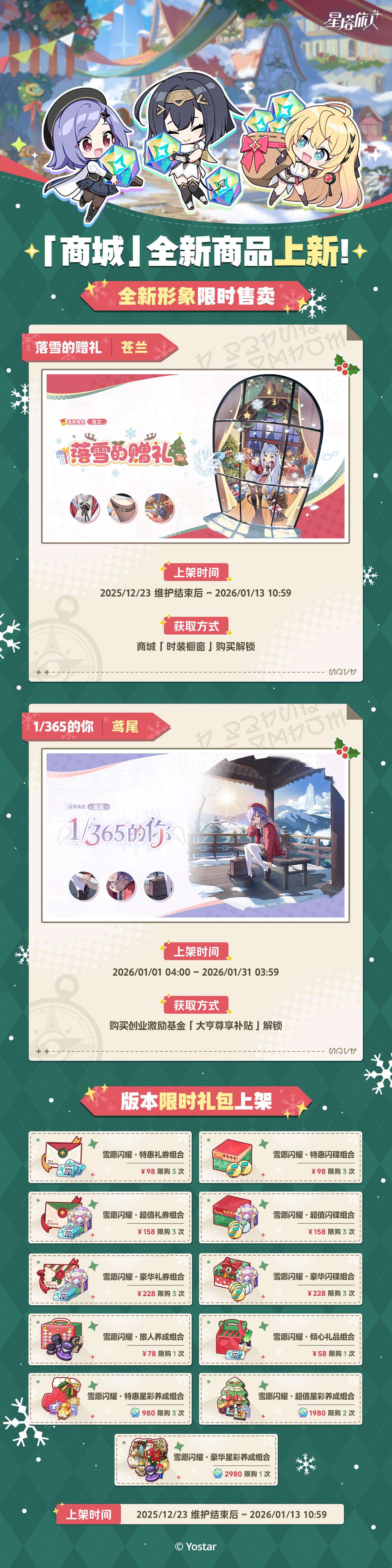 尊敬的魔王大人,欢迎归来!《星塔旅人》「闪耀的使者与圣夜的精灵」将于12月23日与大家正式见面,以下是版本全新限时商品信息,请您查收~■ 创业激励基金售卖时间:2026/01/01 04:00 ~ 2026/01/31 03:59■ 旅人形象- 苍兰全新3D战斗形象「落雪的赠礼」售卖时间:2025/12/23 维护结束后 ~ 2026/01/13 10:59获取方式:商城「时装橱窗
