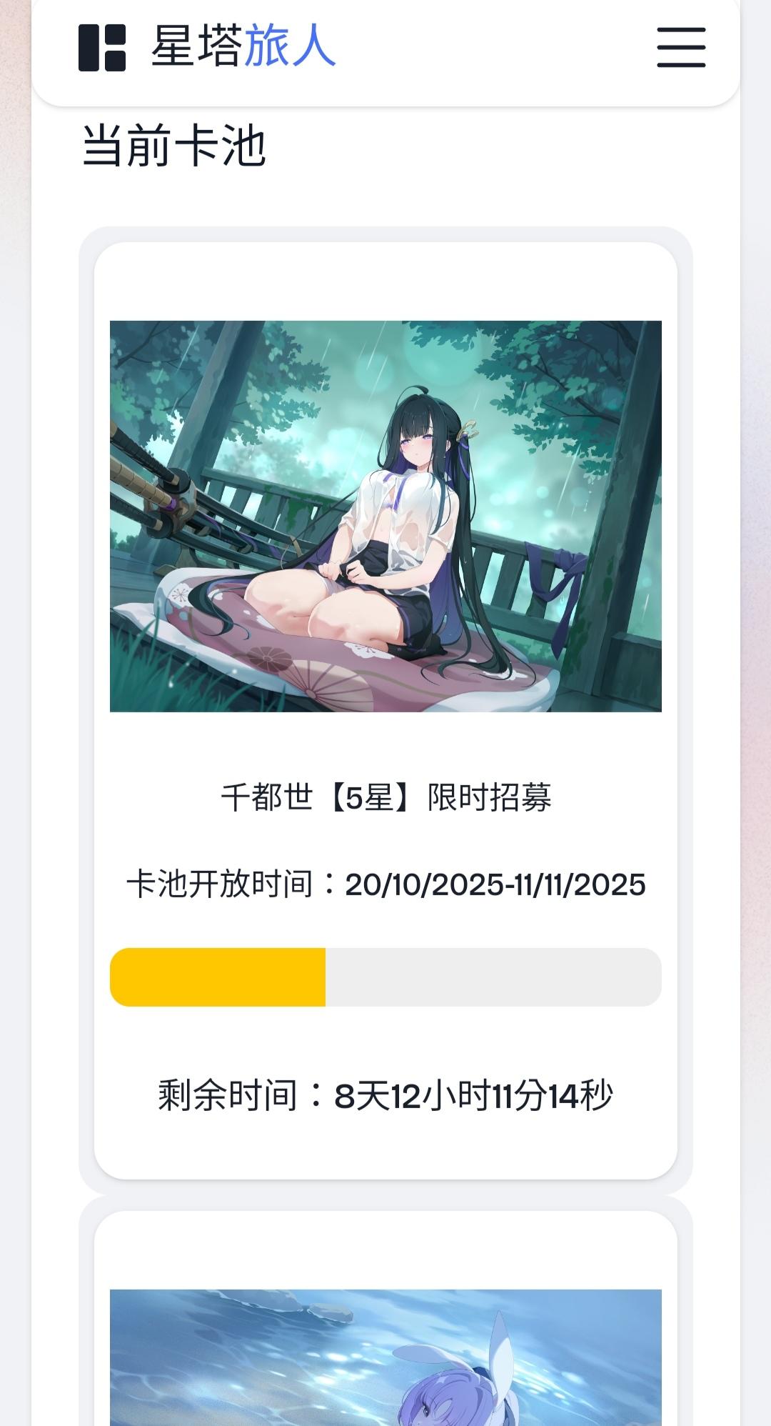 玩了一下你游感觉角色很顶,但奈何天坑的卡池使我抽不到角色...所以干脆自己搞了角色立绘,同时顺便做了一下卡池/活动倒计时及角色生日播报,可以进角色立绘下载