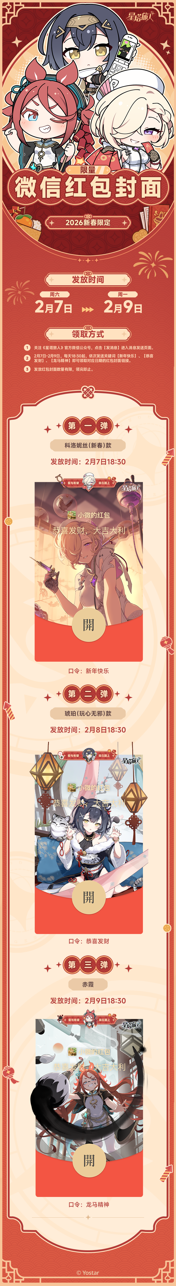 尊敬的魔王大人,新春佳节即将到来,我们为您准备了新春特辑——《星塔旅人》春节主题微信红包封面,详情可查阅↓↓↓【领取时间】2026年2月7日-2026年2月9日 每日18:30【领取方式】①关注《星塔旅人》官方公众号,点击【发消息】进入消息发送页面②2月7日-2月9日,每天18:30起,发送当日关键词,即可通过链接领取对应红包封面2月7日18:30:【新年快乐】2月8日18:30:【