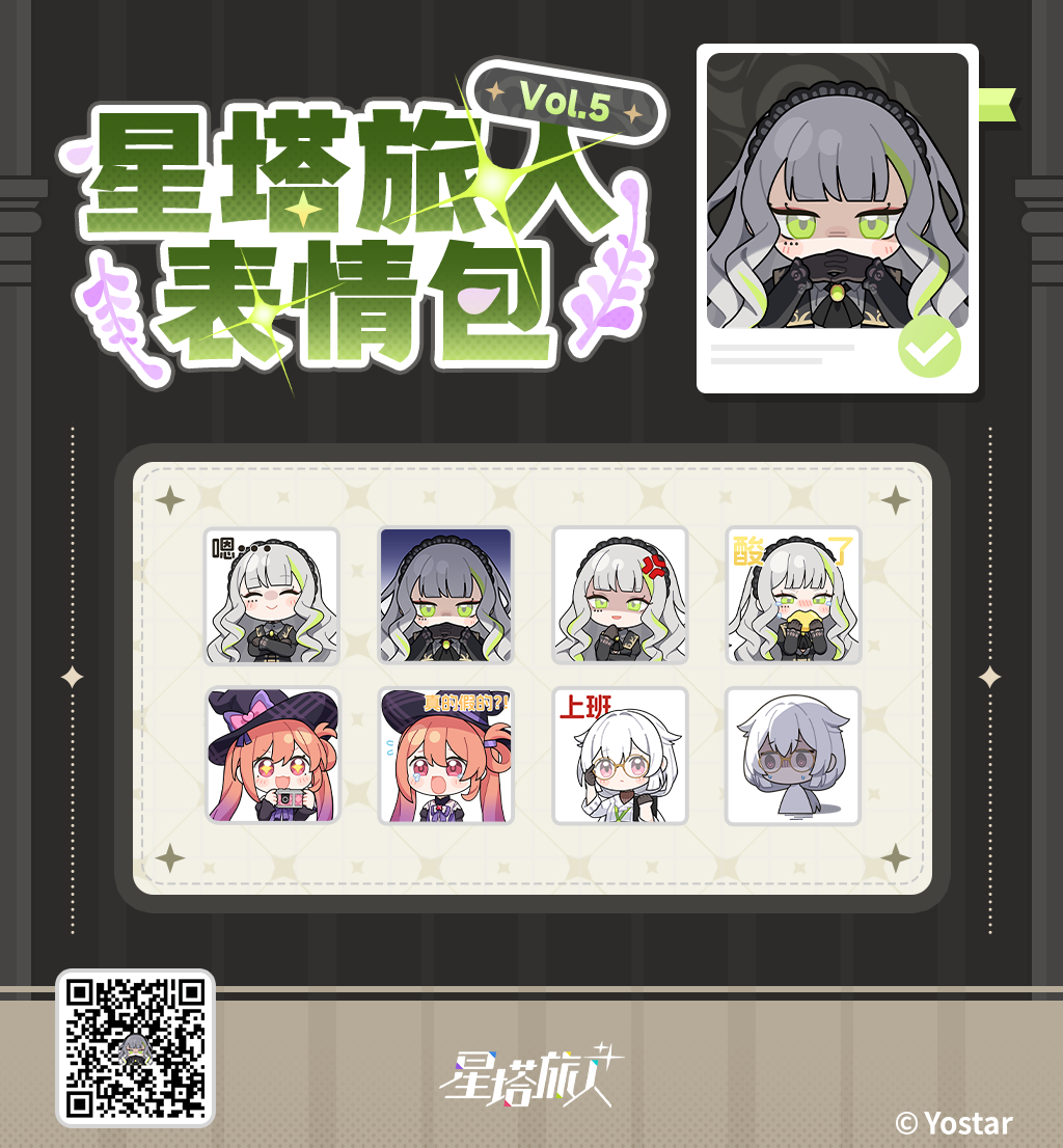 尊敬的魔王大人, 《星塔旅人》表情包「星塔日常篇第5期」现已开放下载~ ✧微信获取方式: 1、使用微信扫描下图二维码即可跳转至对应表情商店; 2、点击微信界面底部导航栏「我」后,点击「表情」按钮,搜索关键词【星塔日常篇】进行下载使用。 ✧QQ获取方式: 1、使用QQ扫描下图二维码即可跳转至对应表情商店; 2、通过聊天界面点击表情,点击底部搜索按钮进入表情商城,搜索关键词【星塔日常篇】进