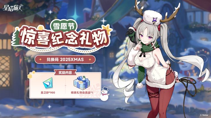 尊敬的魔王大人,欢迎归来!为纪念诺瓦大陆一年一度的「雪愿节」,星塔的员工额外为各位魔王大人准备了雪愿节惊喜纪念礼物!魔王大人可前往游戏内,点击右上角侧边栏菜单按钮进入「菜单」页面,点击兑换码按钮输入兑换码即可获得奖励!▌奖励兑换码2025XMAS▌奖励内容星之砂*900、精美礼物自选盒*1▌奖励兑换时间2025/12/25 19:30 ~ 2026/01/13 10:59祝魔王大人