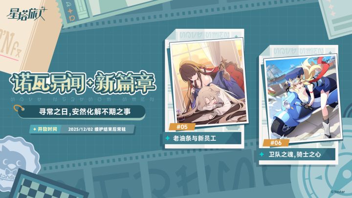 踏上诺瓦之旅的魔王啊,愿听那旅人之事,宛如繁星闪烁于您旅途的夜空。诺瓦异闻全新篇章即将开放,魔王大人可从异闻中探寻独属于旅人少女们的故事。▌活动说明诺瓦异闻开放全新篇章第五篇「老油条与新员工」与第六篇「卫队之魂,骑士之心」。▌开放时间2025/12/02 维护结束后常驻____________✦了解更多✦成为魔王的轻喜剧奇旅RPG,星塔旅人全新限时活动 「我们的旅团」现已开启!T