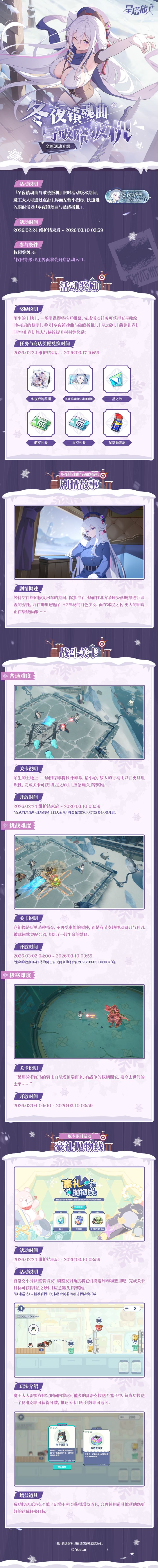「冬夜镇魂曲与破晓扳机」限时活动即将开启。陌生的土地上,一场阴谋即将拉开帷幕。完成活动任务可获得五星秘纹[冬夜后的黎明]、称号[冬夜镇魂曲与破晓扳机]、[星之砂]、[萌芽礼券]、[青空礼券]、旅人与秘纹提升材料等奖励!*首日开放战斗关卡[应急罐头]获取效率与后续开放关卡效率一致,魔王大人可自由分配关卡刷取时间。查看长图可了解活动详情~▌活动时间开放时间:2026/02/24 维护结束后 ~