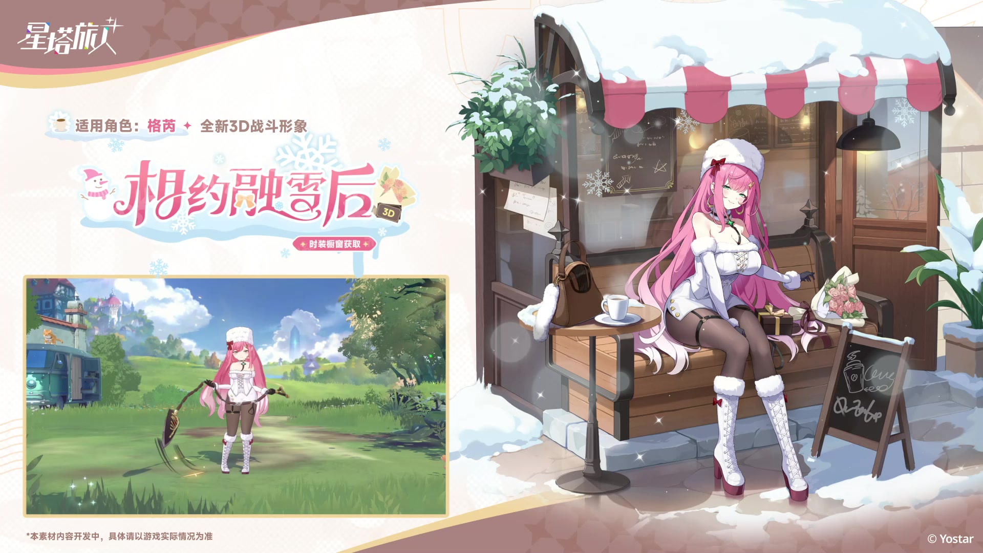 咖啡的酸涩,蔷薇的芳香,想将一切新奇的体验都与你分享。融雪后,来一场约会吧? 售卖时间:2026/02/24 维护结束后 ~ 2026/03/17 10:59 获取方式:商城「时装橱窗」购买解锁 ※实装效果以游戏内为准