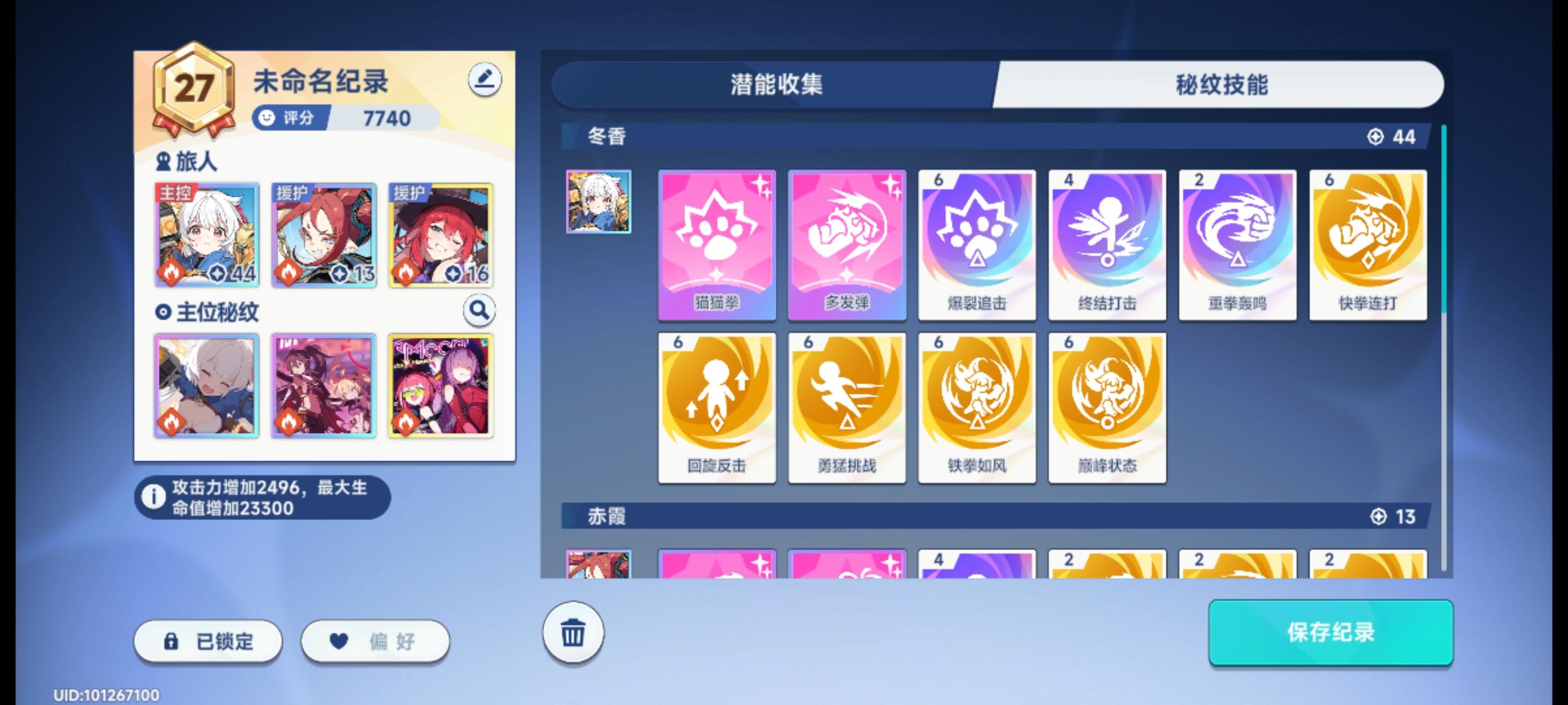 听我一句劝,能买潜能就买潜能,不要被半价音符骗钱了,也不要被彩色记录给的高数值骗了,都是假的,难度7的星塔就是刷不出来完美毕业的彩色记录的! 个人练度如图,冬香版本入坑的新号,1+0冬香,80级未突破8级技能,两个纹章是凑数的,但是超绝42抓10种核心潜能,2级的重拳轰鸣是凑数的,这个潜能在技能流派冬香里面打不了多少伤害。 辅助更烂70级未突破,技能没升纹章没有,潜能一个13抓一个16抓有多烂