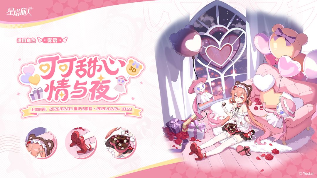 沉醉于可可的甜蜜,扫帚划过星空,将烦恼抛之脑后——这是只属于你们的浪漫冒险。 售卖时间:2026/02/03 维护结束后 ~ 2026/02/24 10:59 获取方式:商城「时装橱窗」购买解锁 ※实装效果以游戏内为准