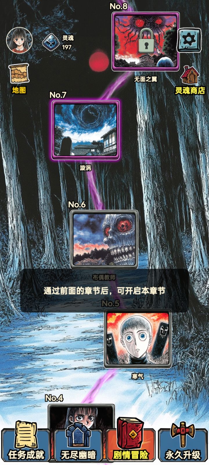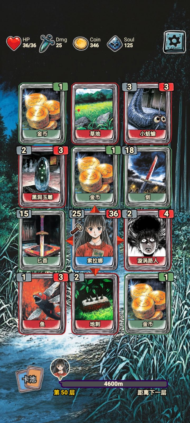 首先吸引我的是这游戏的画风,致敬了伊藤润二的风格,能在卡面上看到各种作品的影子。游戏剧情方面,剧情存在感弱得可以忽略剧情。玩法上比较简单,上下左右走格子,加减攻击、生命。属于是一款休闲的小游戏,可以打发打发时间。