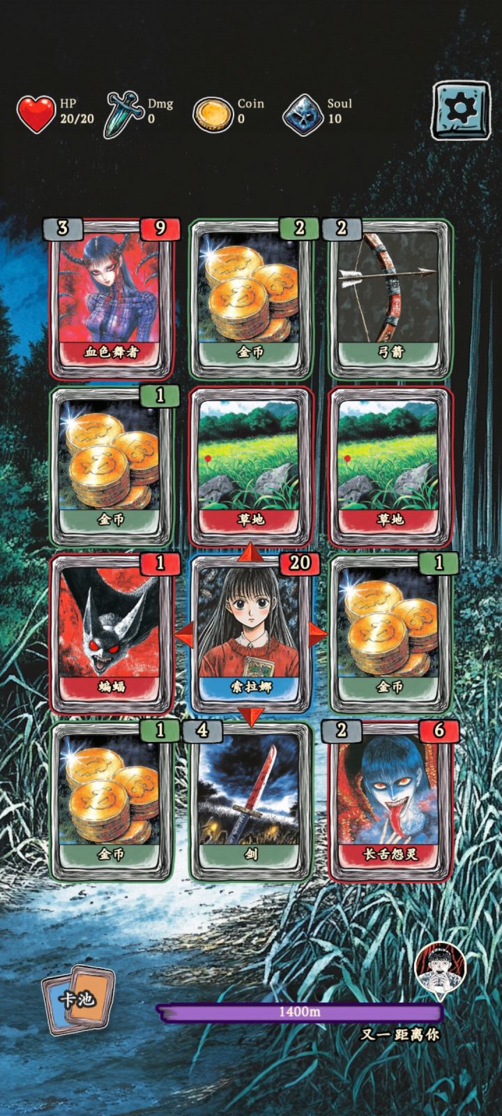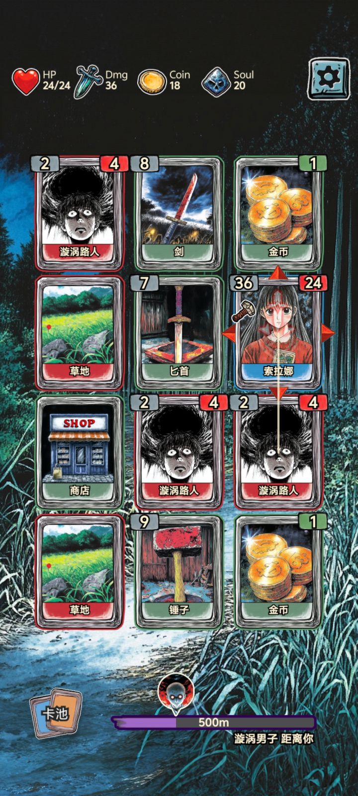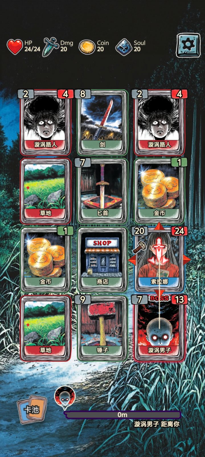 #索拉娜的冒险 发现了一款相当硬核的卡牌新游戏‼️👀而且……漩涡、蛞蝓、十字路口的少年……介不伊藤润二吗虽然游戏的画风比较阴森,但大家放心👋怂如老墨亲自体验了并没有什么恐怖的地方。只是以诅咒和诡异为题材,可以放心大胆地玩。游戏本身是非常核心的卡牌战斗。初始玩家只有20点血量,被攻击力高的怪一次就可能打掉四、五点,所以每走一步都要计算上下左右卡牌会引起的数值变化。卡牌大致分为怪物、武器、功能