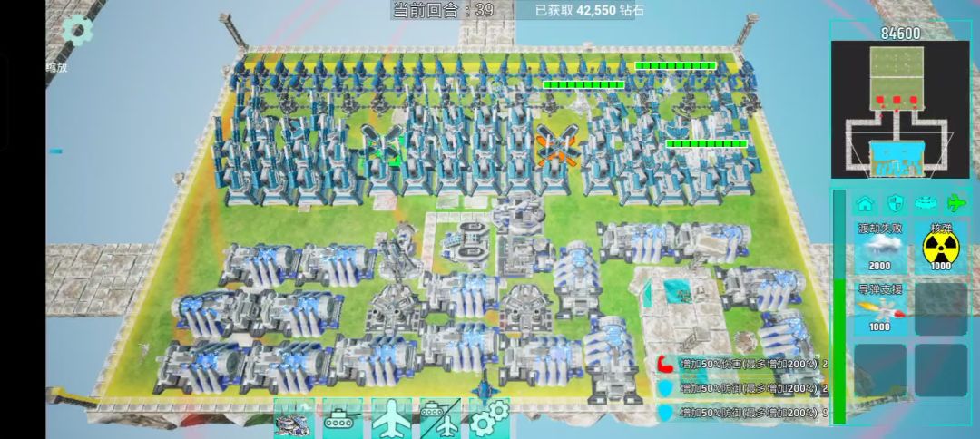 词条:免疫+防御+防御+防御 这套词条可以让你的围墙在无尽模式处于无敌得状态,当然掉血了也没关系,后排还有一排装载了2治疗词条的地雷提供回复,让你先天立于不败之地,不过我这波防空已经扛不住了被炸得稀烂,所以我卖掉了左下角的穿透激光想争取在下一波刷出来之前补满被炸掉的防空(反正有无敌的围墙挡着),可以补到一半游戏闪退重启了