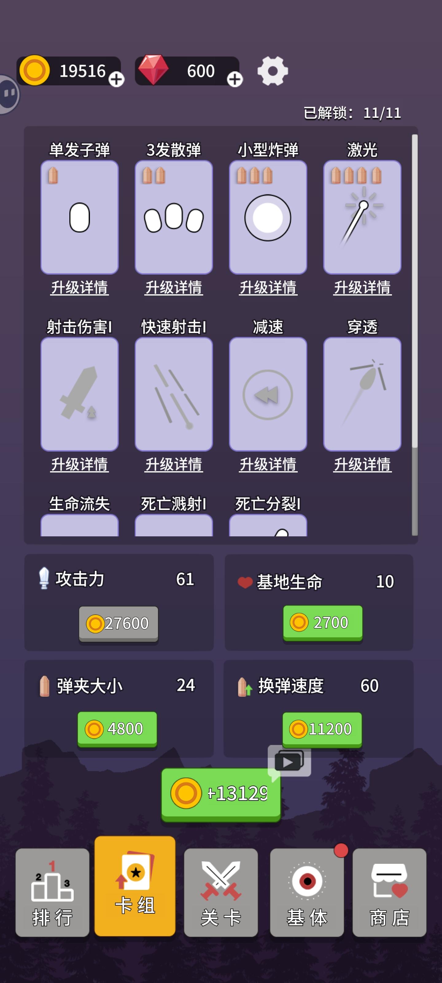 当然全升满基体也不是很必要,看一二百拿钻开的基体,每局4广告开满技能,N个广告上buff随机3选1,也足够通关无尽87波了。能玩的。
