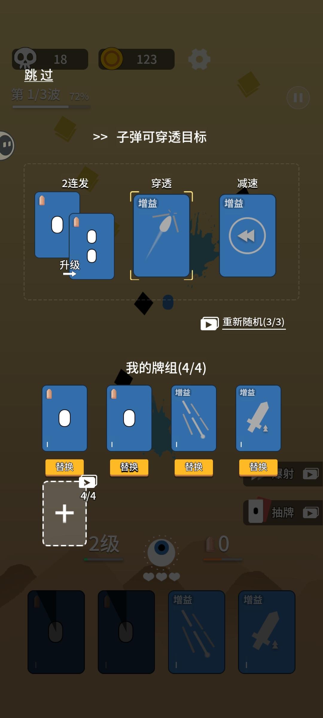 终极消灭者是一款塔防肉鸽放置手游,游戏玩法简单易懂,玩家操作基体,基体会自动瞄准最近的敌人,消灭敌人可获得经验和金币。等级经验值满后,即可随机获得三选一加成。金币可用于升级初始装备和生命值。击杀所有敌人即可通关。 游戏一点进去,就是一个非常简洁的初始界面,我们可以选择初始牌组,不同的牌组有不同的功能,可以达到射出多发子弹,提高子弹的伤害或提高射击频率等等的效果。选择好想要的牌组后,可以切到我们