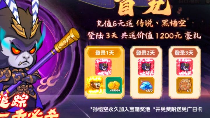 #猴哥快跑攻略 开局可以首充六块,获取强力角色黑神话悟空,首次攻击三倍伤害,非常划算,前期把能买的体力买满,跟着主线做任务提升等级。前期等级越高越好,能解锁更多关卡。 战力礼包也很划算前期1块钱就可以购买,可以获得很作钻石和碎片,快速提升战力,购买后第二天战力礼包会刷新,出现更好的道具,价格也会慢慢提高,但是有非常珍惜的羽毛道具,能提升大量战力月卡也可以充,最好是双月卡,每天都能领取钻石