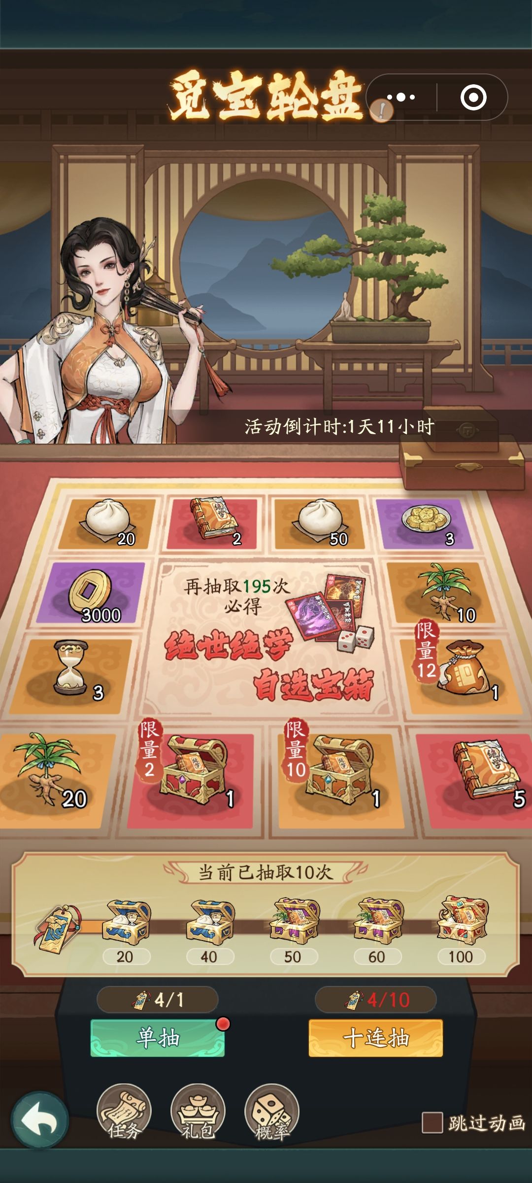 如果 你坚持到第三天了!那么大概率你会继续玩下去,请看下面: 第三天 请重复第二天内容。 虽然今天闯关活动结算,但是这是氪佬的专属肉菜。如果打不过看看关卡怪什么属性高。把轻功换成对应抗性的就行。 今天会开启一个小活动,打牌。会打金花推饼的应该都会玩。顺子 炸子 同花顺最大! 无聊可以刷刷,花1~2000玉能得到1本红色招式还是值得的。特别是前期。 第四天 今天会开启一个新的活动。至宝寻
