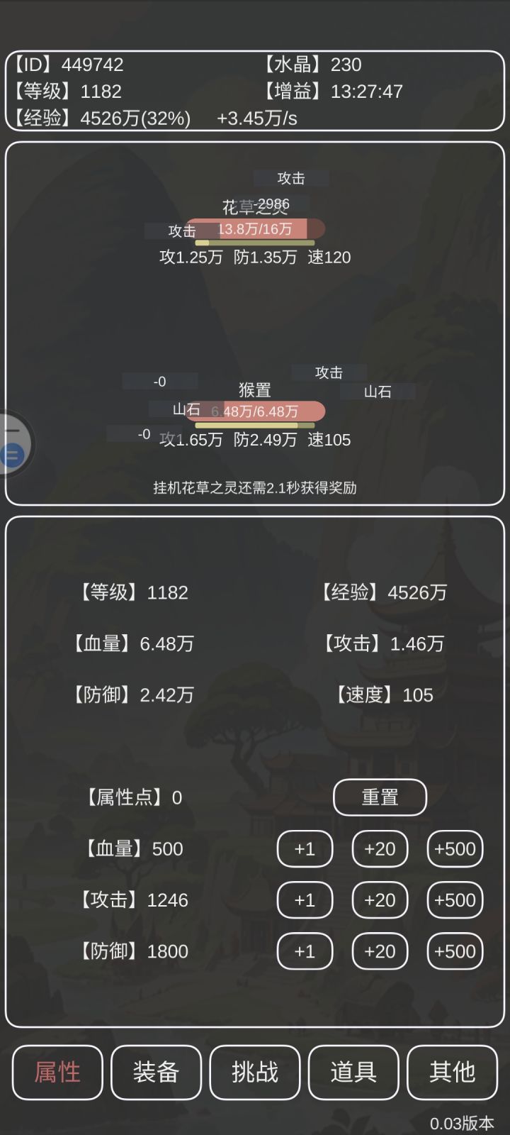 防御防御点540点。以后其他全部点攻击,只要初始攻击到4600就可以了打完大概在110秒左右秒,收益会多一倍还是可以的。技能要带舞动和小妖,其他都是常规技能