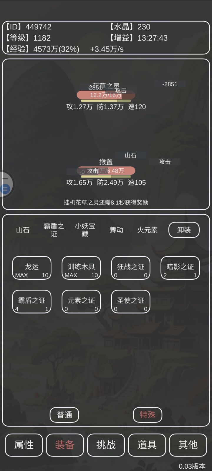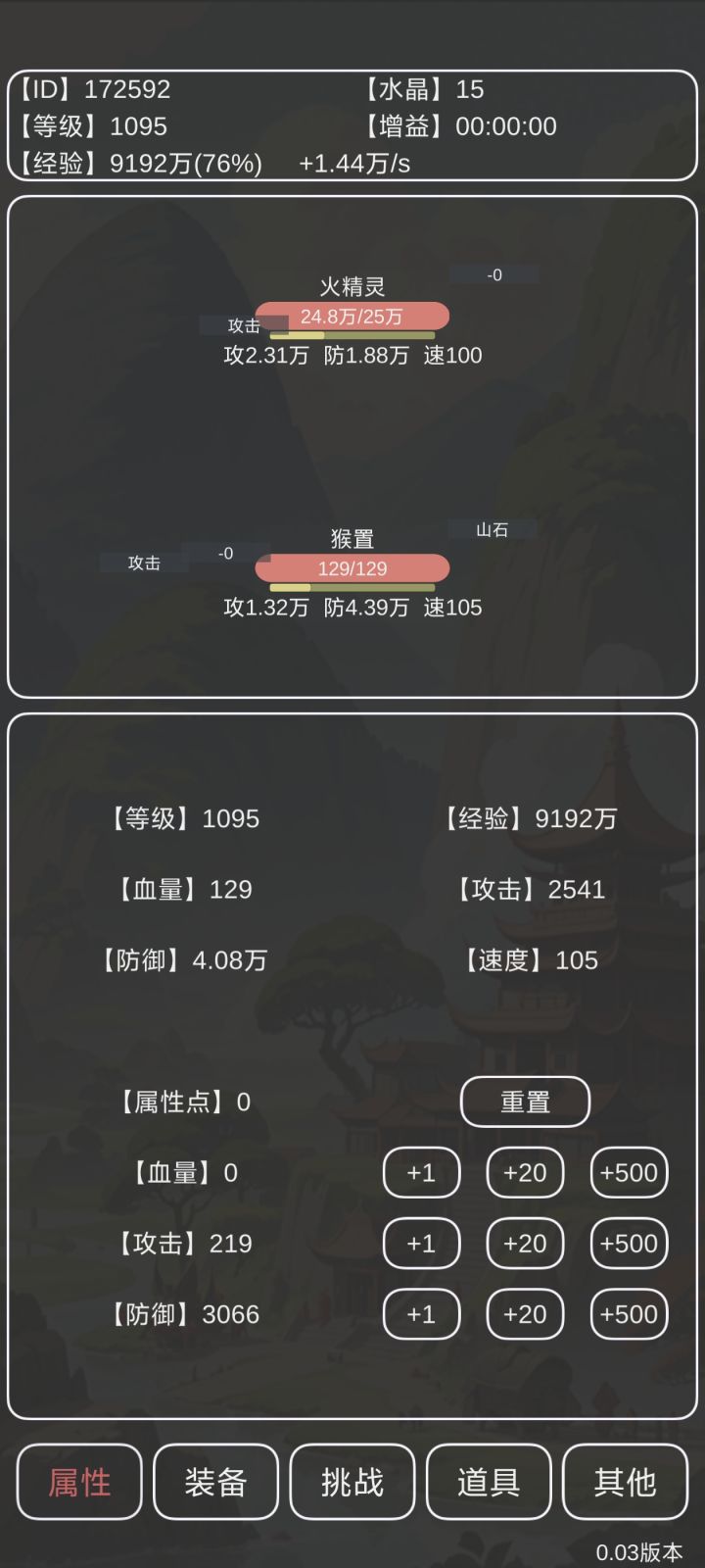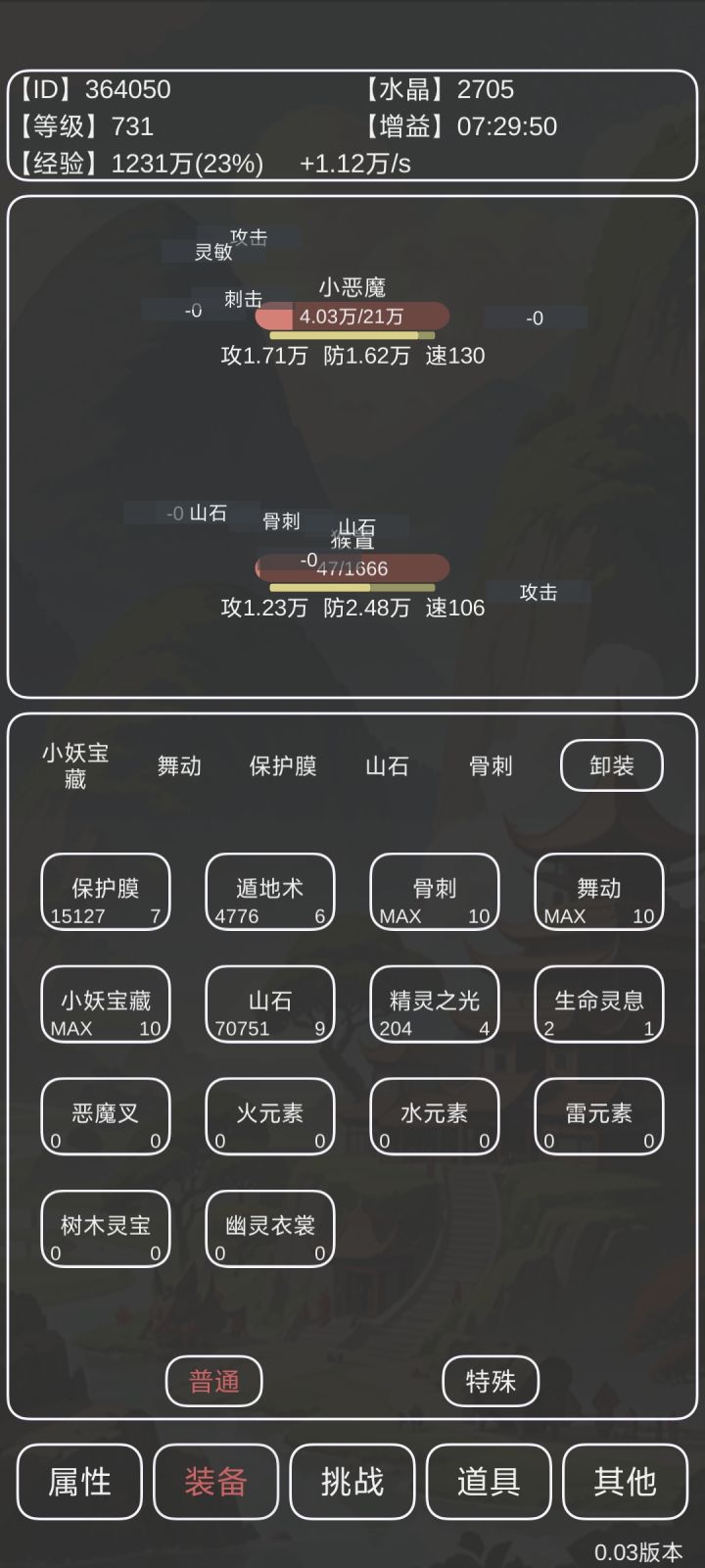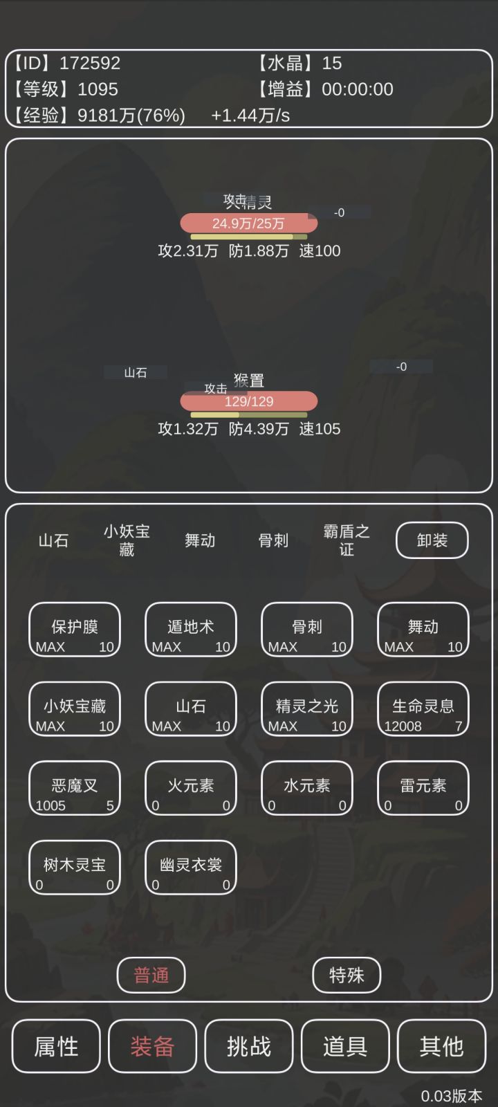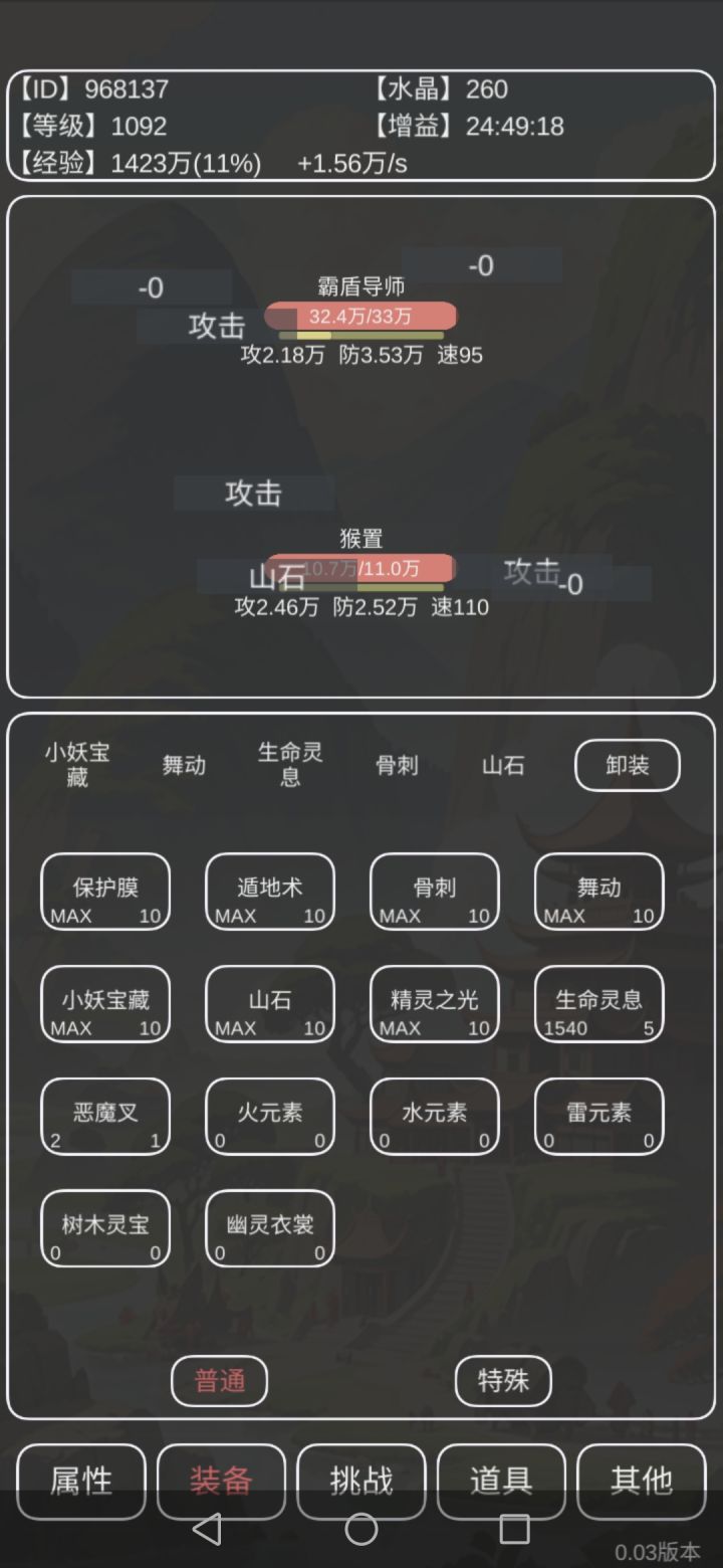 接近极限过火精灵,因为有燃烧,所以一滴血都不能卖。需要满史莱姆满山石有盾转职,3066防御,攻击可以再少几点,现在一个骨刺200多血
