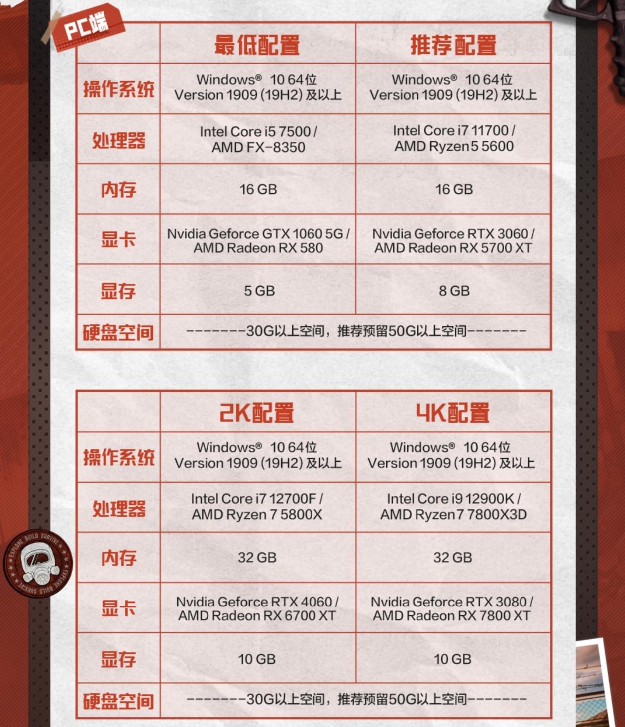 哈喽兄弟们,对没错,还是我!山屿 眼看着测试马上就快要开始了是不是有很多新手不知道直接的手机,平板,电脑不知道能不能玩这个游戏!!!今天就带大家一起进入今天的主题《新手教程系列第七期——手机电脑配置需求》。一、PC端- 最低配置:Win10 64位(1909+),i5 6500/Ryzen 5 1500X,内存16GB,显卡GTX 1060 5GB,DirectX 12,预留≥30GB(推荐5