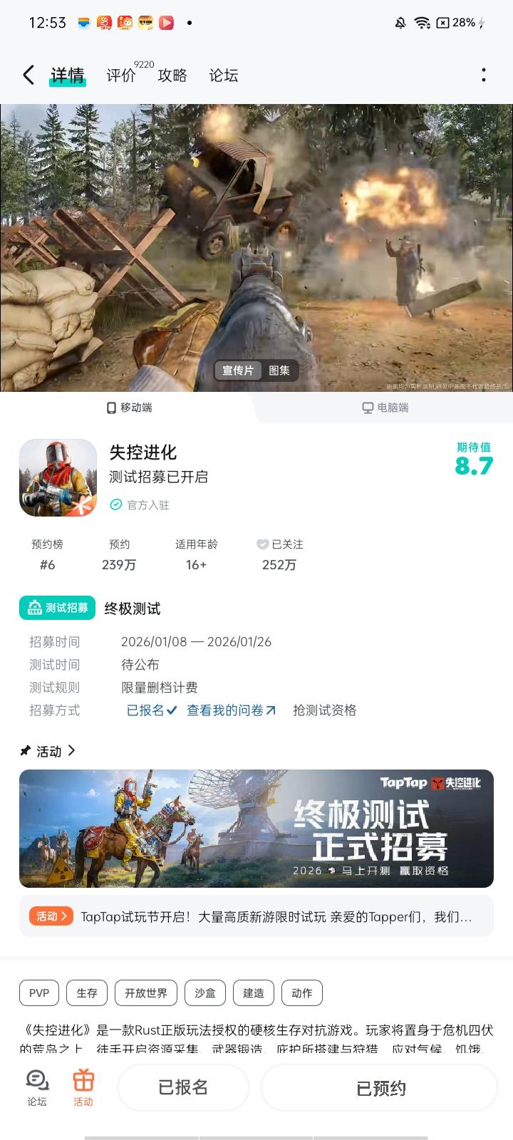 大的来了家人们!失控进化的玩家们终于盼到了!近日 期待好久的“终极测试”招募正式启动了。 报名招募通道一开启,社区都吵疯了! 这游戏其实就是款末日生存对抗类手游,在超大的开放世界里,你得捡木头、矿石这些资源,自己建房子、做武器,既要防野生动物袭击,还得小心其他玩家抢东西。 而且这次资格再加码,官方还会在评论区当中抽出200个幸运儿来送资格!之前参与过小规模测试的玩家都夸好玩,这次终极测