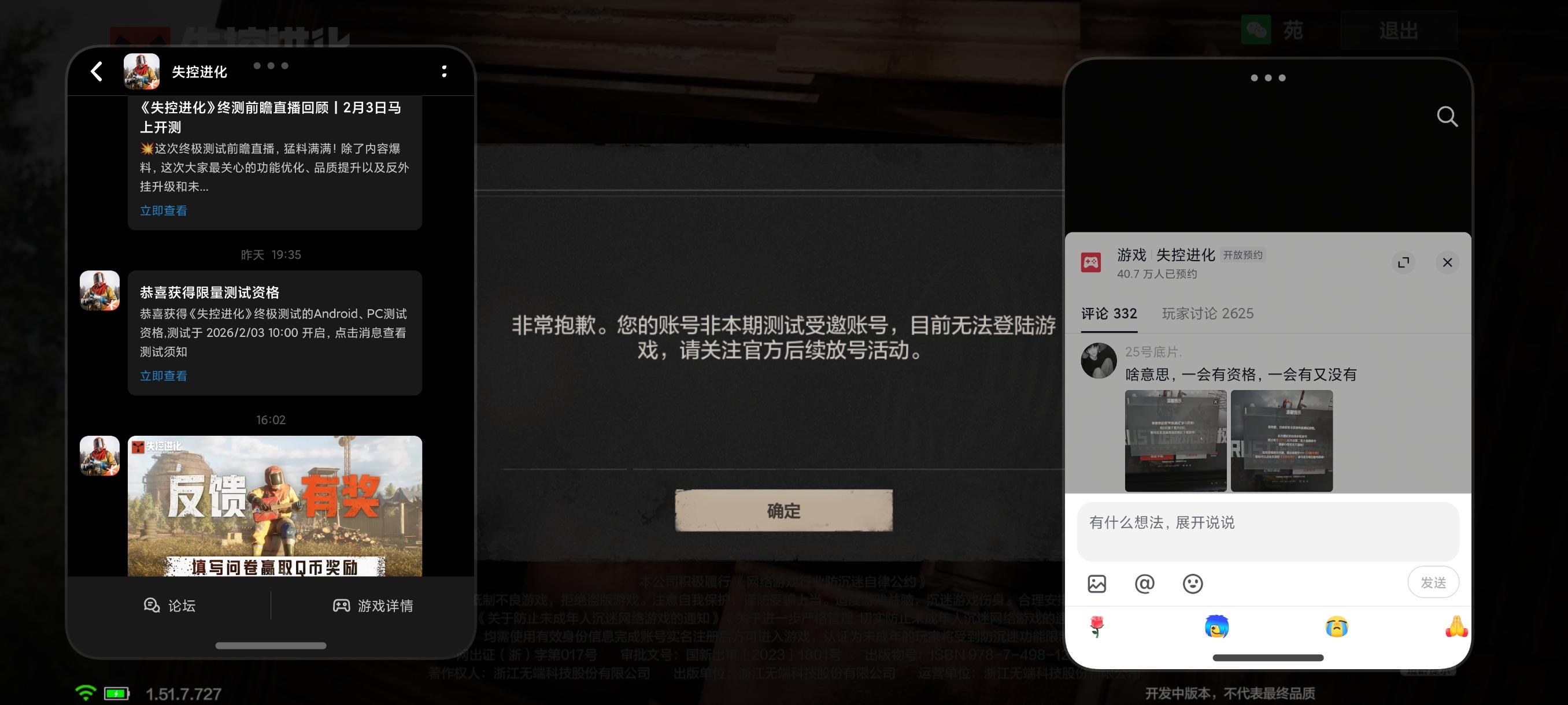 🥰兄弟伙们准备好了吗?大家期待已久的《失控进化》终极测试资格查询及预下载现已开启,游戏将于2月3日10:00正式开服!💥小黄把详细攻略都整理好了~看完这张图,让你一次到位,上岛无忧!👀还没拿到资格的兄弟伙们也不用担心!本次测试规模空前,官网、社区等多重渠道持续开放海量测试资格放号活动!偷偷告诉你,在评论区留言,还可能触发小黄专属资格彩蛋哦~*小黄提醒:凡是参与过 “灯塔测试”“登岛测试”“体