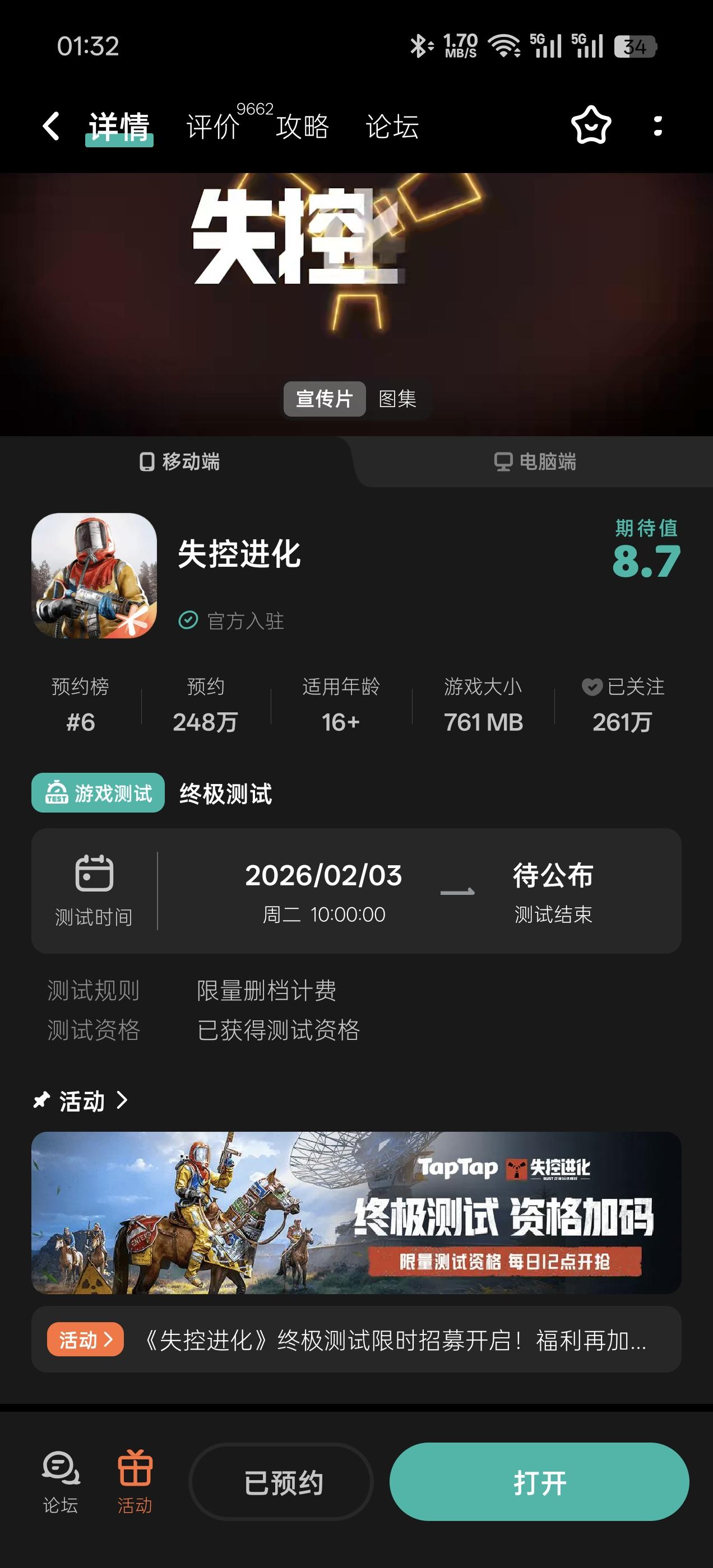 🥰兄弟伙们准备好了吗?大家期待已久的《失控进化》终极测试资格查询及预下载现已开启,游戏将于2月3日10:00正式开服!💥小黄把详细攻略都整理好了~看完这张图,让你一次到位,上岛无忧!👀还没拿到资格的兄弟伙们也不用担心!本次测试规模空前,官网、社区等多重渠道持续开放海量测试资格放号活动!偷偷告诉你,在评论区留言,还可能触发小黄专属资格彩蛋哦~*小黄提醒:凡是参与过 “灯塔测试”“登岛测试”“体