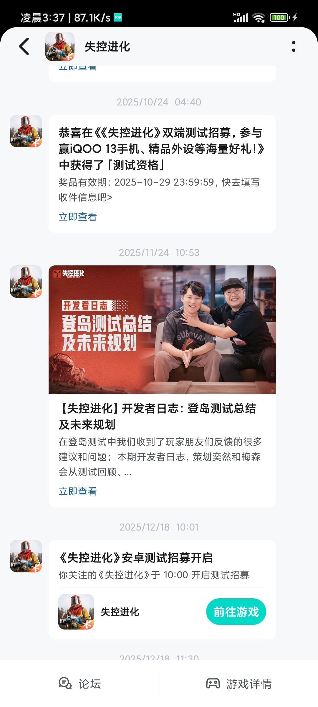 亲爱的玩家们,本次活动已经圆满结束啦,感谢大家的热情参与~现在就为大家公布本次活动的获奖名单~恭喜以上玩家获奖。*请获奖玩家注意评论留言信息,在1月31日12点前回复【失控进化】官方版主号提供您的获奖信息,逾期将视为放弃领奖哦~——————————大家期待已久的「终极测试」前瞻直播将在本周日19:00全平台开播!直播中会有最新内容和新玩法爆料,还有iPhone17、罗技鼠标、精美周边等超多奖