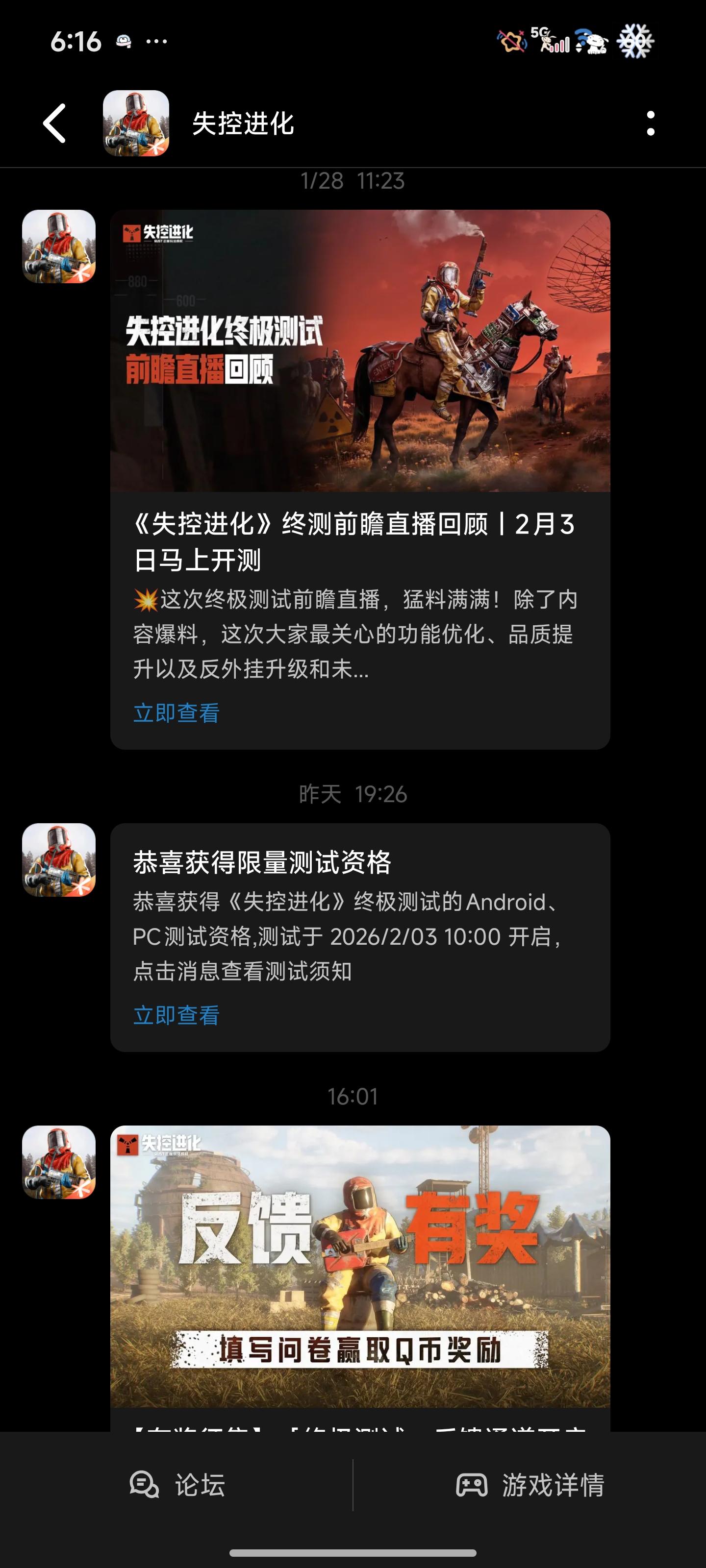 ▫️ 正文:游戏名称:时空进化(体验服/测试服)核心问题:本人已成功获得时空进化体验资格(附资格截图),但无法登录/进不去游戏,急需官方排查解决!具体症状(直接抄/改):(例:点击登录提示无资格 时空进化体验资格已到手,无法登录/进不去,求官方加急处理! 有一样的友友吗?资格证明截图以附#失控进化测试