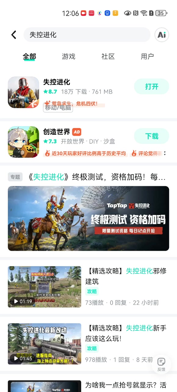 大的来了家人们!失控进化的玩家们终于盼到了!近日 期待好久的“终极测试”招募正式启动了。 报名招募通道一开启,社区都吵疯了! 这游戏其实就是款末日生存对抗类手游,在超大的开放世界里,你得捡木头、矿石这些资源,自己建房子、做武器,既要防野生动物袭击,还得小心其他玩家抢东西。 而且这次资格再加码,官方还会在评论区当中抽出200个幸运儿来送资格!之前参与过小规模测试的玩家都夸好玩,这次终极测